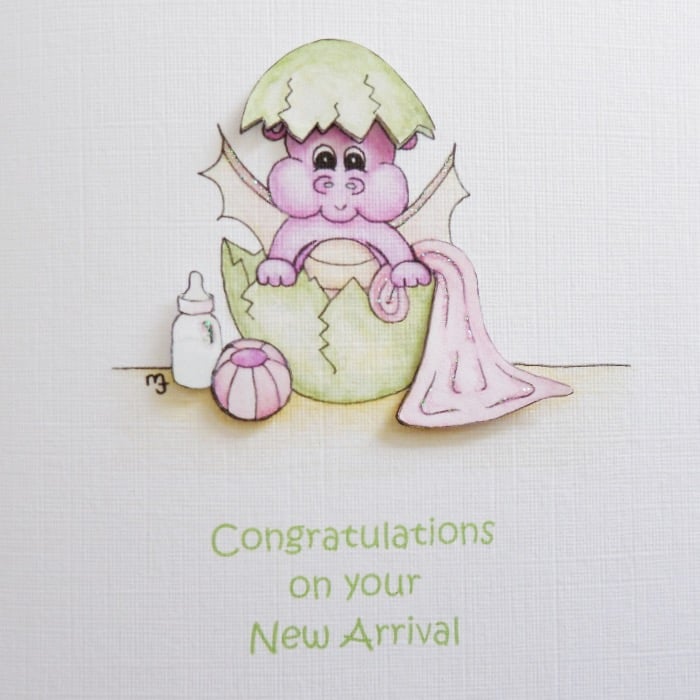 This cute baby dragon card has been designed using my own original watercolour illustration. The card has been printed out onto good quality linen embossed card. The card has been decoupaged up in parts and finished off with a little glitter detail.