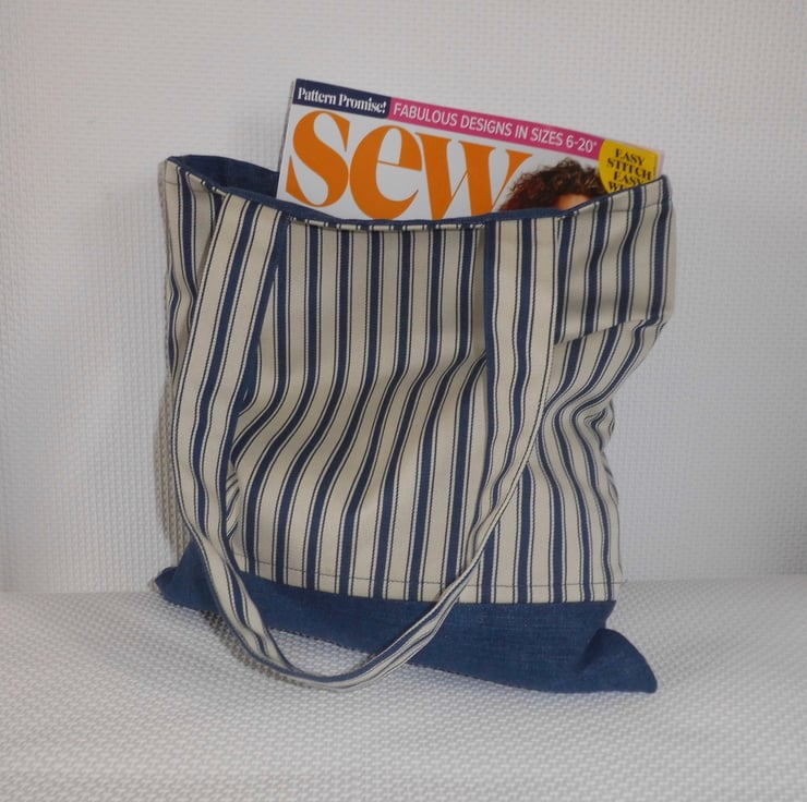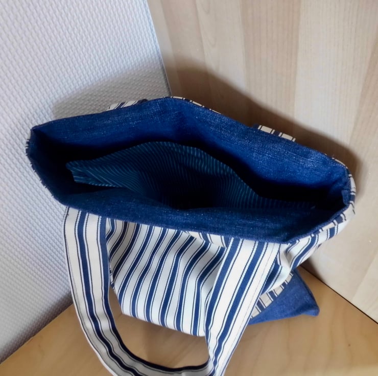 I've made this tote bag with a strong navy and white striped cotton. Fabric used for lower half and inside facing is a dark blue denim, re-purposed from a pair of jeans.