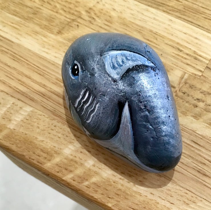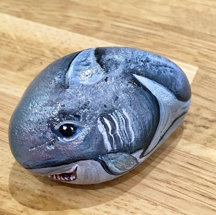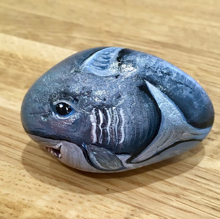This little shark has been painted onto a stone and glazed for a glossy protective finish. It has a natural hole where the mouth is so a great unique stone