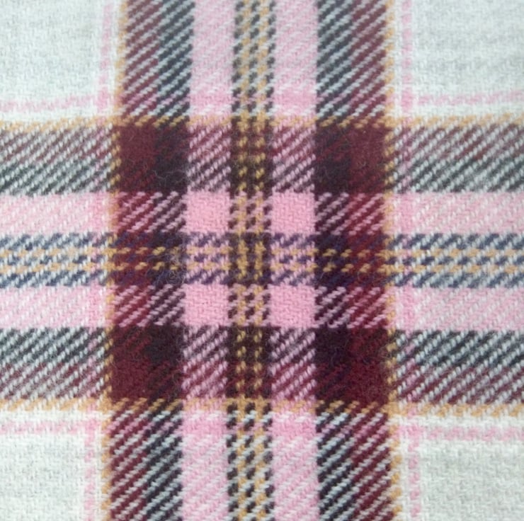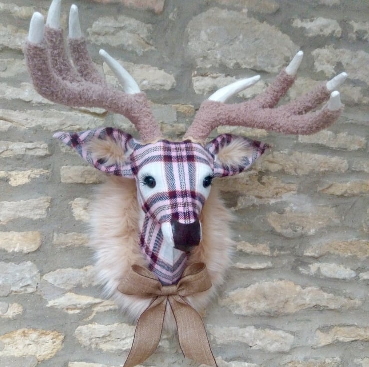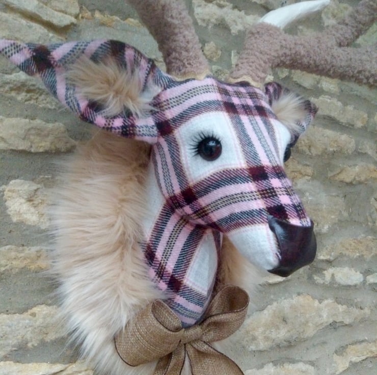 Handmade in pink, brown and cream plaid fabric wall mounted stag deer.