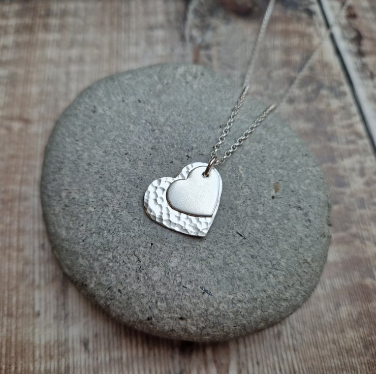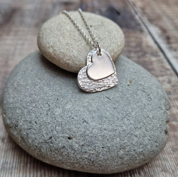 This beautiful Double Heart Necklace features two overlapping hearts, each crafted from recycled sterling silver. The larger heart showcases a hammered texture, adding a touch of sparkle, while the smaller heart has a smooth, matte finish for a lovely contrast. The layered design creates a meaningful symbol of love and connection, making this necklace both elegant and sentimental.