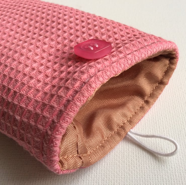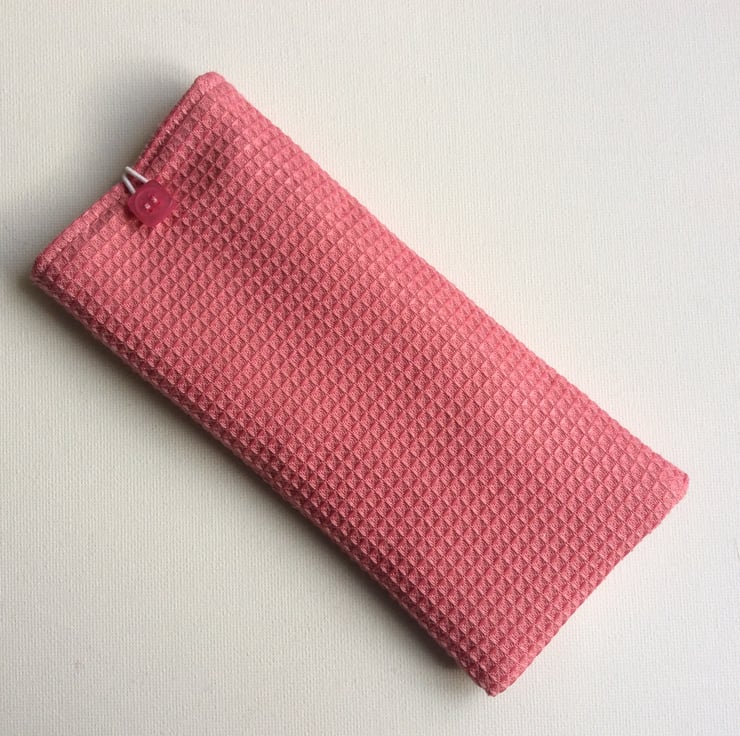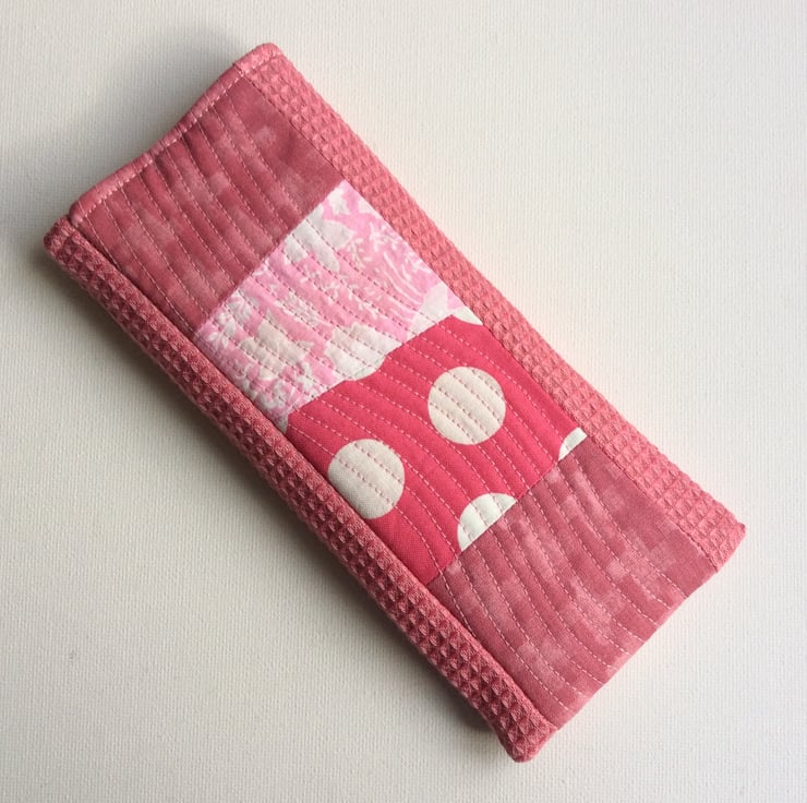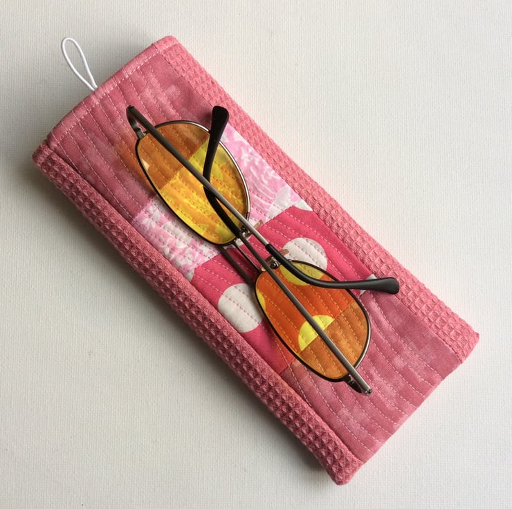 This glasses, sunglasses case has a panel of quilted patchwork on the front in pink shades set into a pink waffle style fabric. The case is lightly padded with a layer of felt and it is lined with a rose gold satin fabric. It has a button and elastic loop closure.