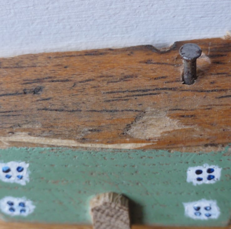 Made from reclaimed oak this little house is painted green and has a rustic wood roof with rusty nail chimney and tiny oak door.