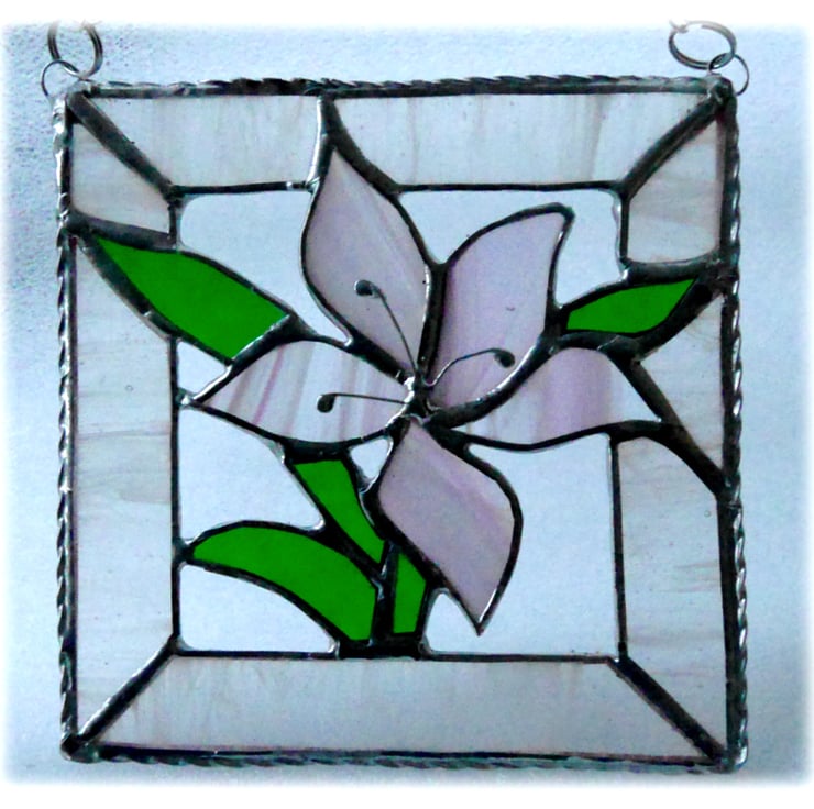 The suncatcher is 12 cm square and hangs from a little silvery chain which is securely attached at either side of the top. It shines beautifully when hanging in the light and shows the lovely textures of the glass.