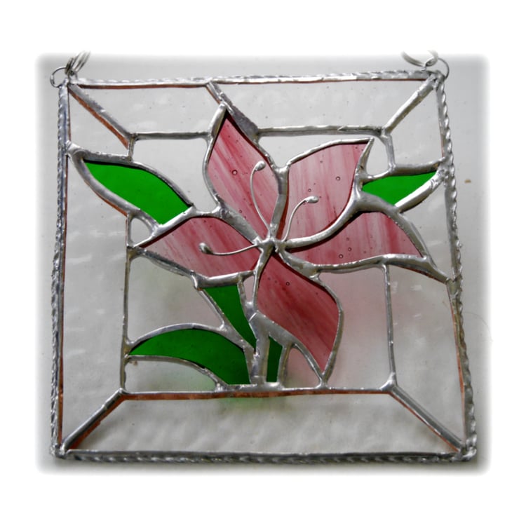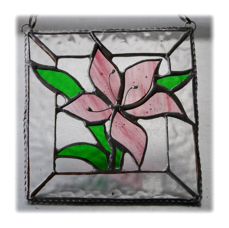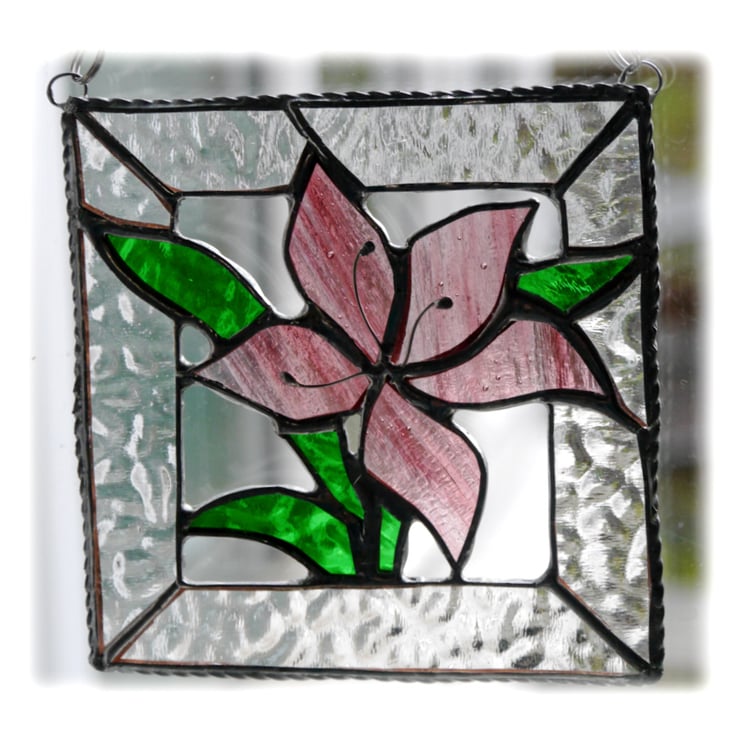 A lovely slightly streaky pink lily with bright green leaves all framed with pretty textured clear glass..