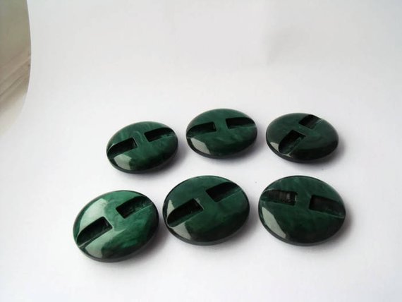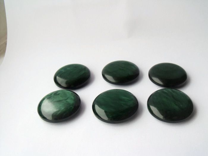 Here is a set of six shiny green marbled pre owned plastic buttons.