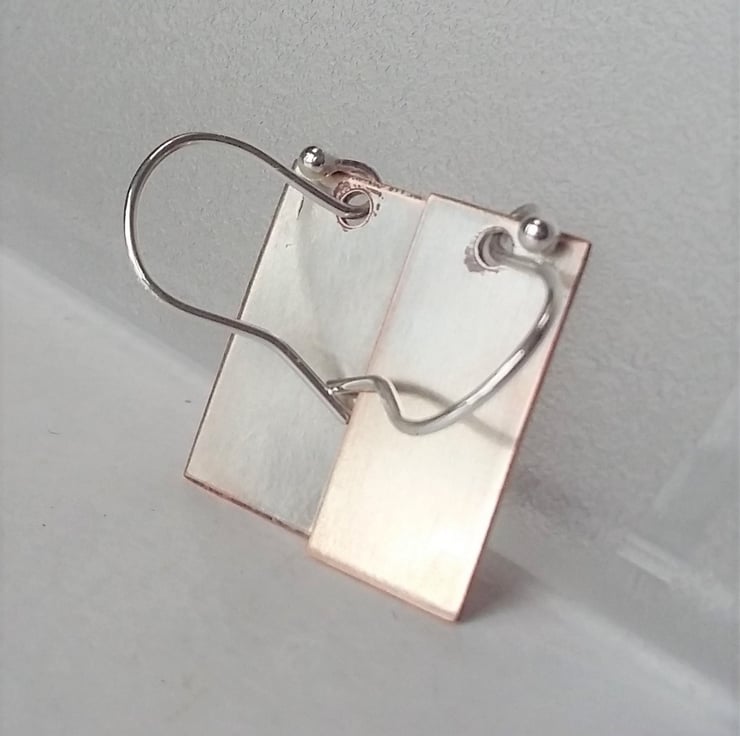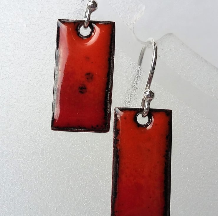 A pair of rectangular copper earrings enamelled in shades of red and orange. The earrings have been kiln-fired and each measures 9mm wide and 19mm long. They come complete with sterling silver earring wires, and the backs have been given a light silver plating to give a polished effect. They are supplied with a little organza pouch and POSTAGE IS FREE!