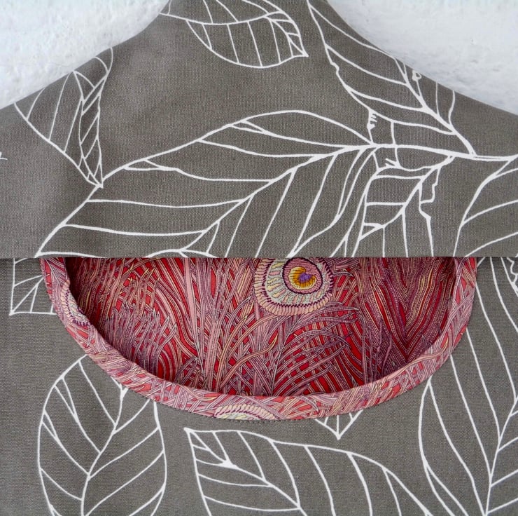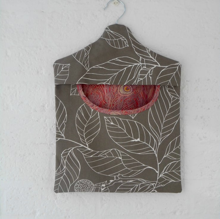 A fully lined peg bag carefully made using a sturdy canvas style fabric from Ikea. The back is lined with a pink printed cotton and you can see this through the opening. The front is lined with plain cotton lining fabric. I have made bias binding from the pink fabric to bind the opening.