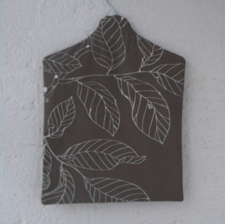 On a wooden coat hanger so it can hang on your line, in your kitchen or laundry room. The design of my peg bags means that the upper and lower fronts are both supported by the hanger, which gives them added strength.