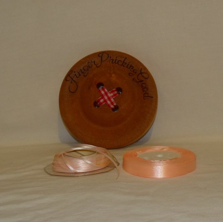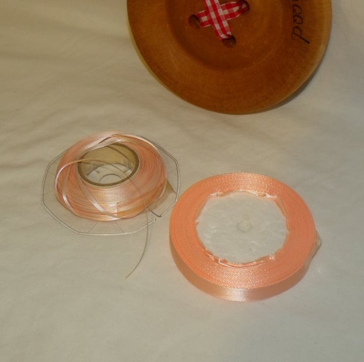 Two rolls of coordinating pink and peach single side satin ribbon.