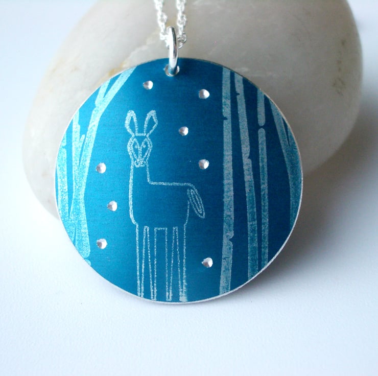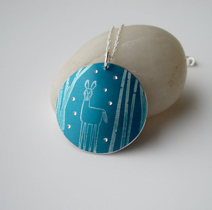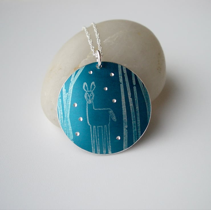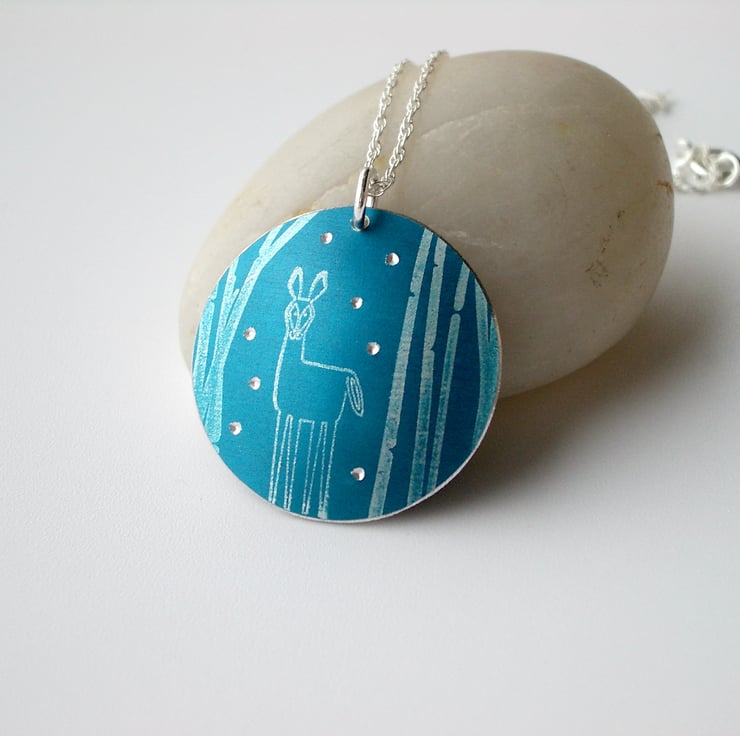 This teal pendant is made from anodised aluminium which I have hand dyed and printed with contrasting silver birch trees and deer. The dye is made permanent through heat and becomes a part of the metal. I hand saw the disc shape by hand, file the edges and finally dome the disc so that it catches the light.