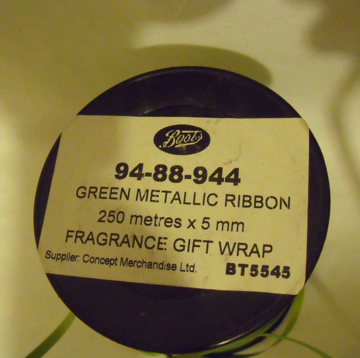 Here we have a large roll of metallic green floristry ribbon.