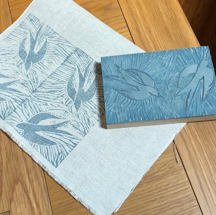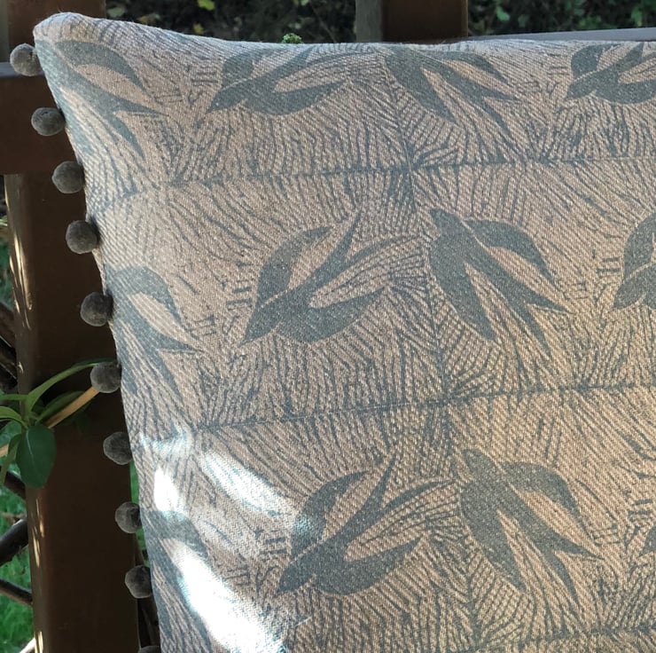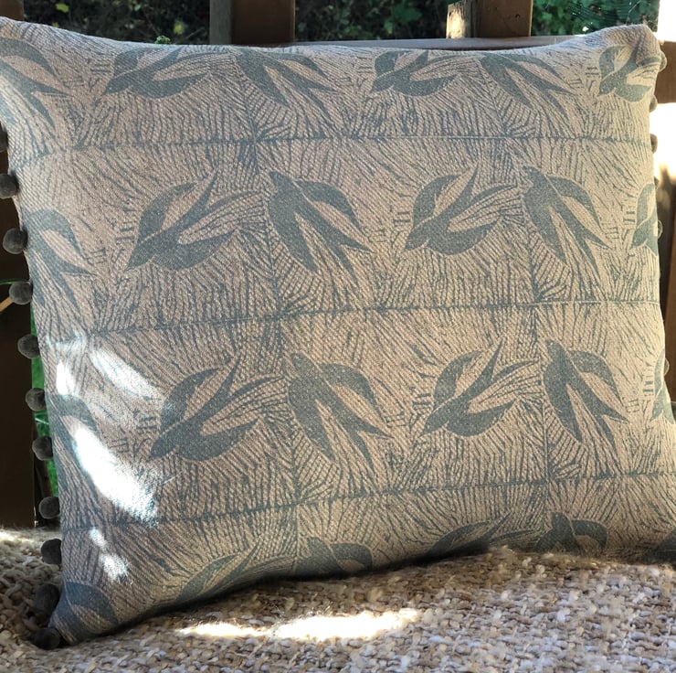 An attractive cushion constructed from a beautiful linen fabric that I have hand printed using a Lino block carved by myself depicting swallows in flight.A dainty dark grey Pom Pom edging has been added to two sides.The reverse of the cushion is a plain linen.It has a zip closure and comes complete with a feather filled insert .All seams have been overlocked.