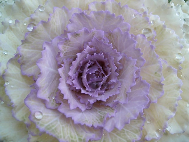 Ornamental cabbage greetings card - I love ornamental cabbages, and my sister had this gorgeous one in a pot on on her patio table one year. With its cream and lilac, frilly edged leaves bejewelled with raindrops it was so pretty and the close up photo came out beautifully.