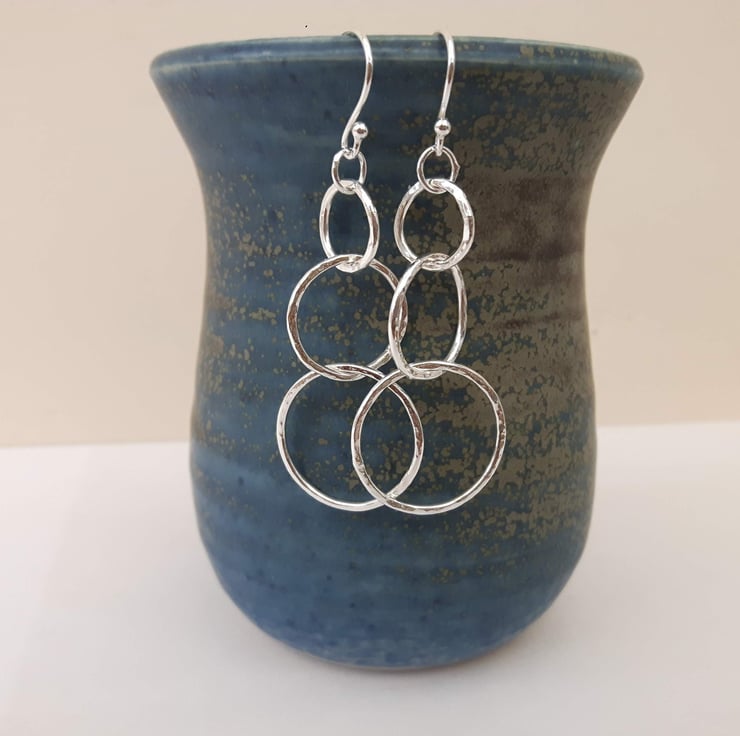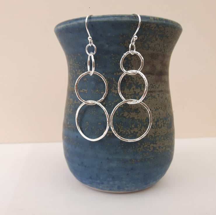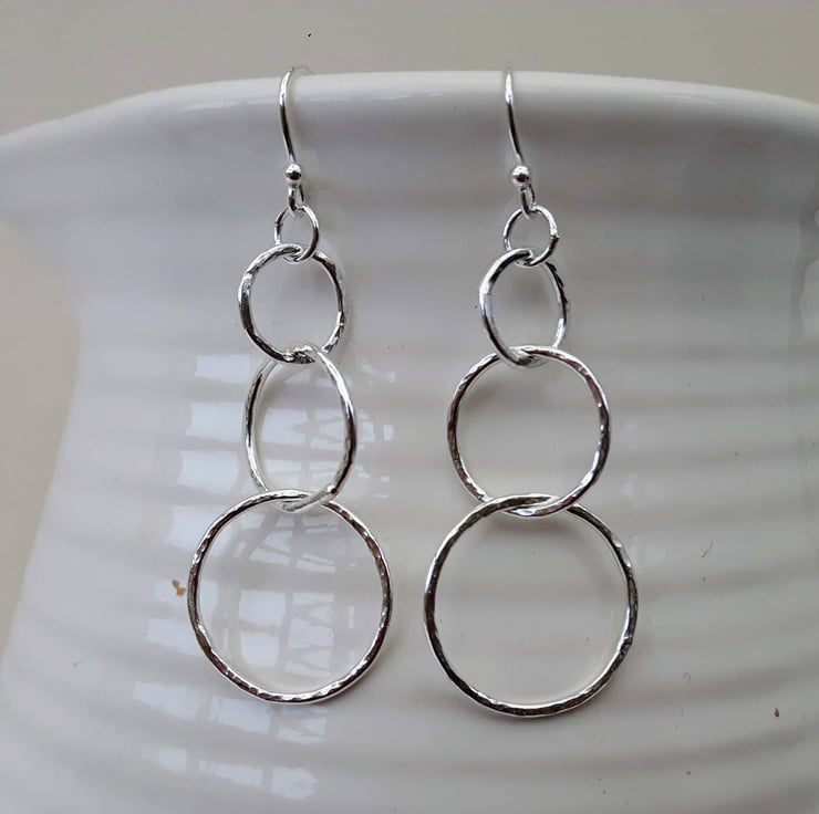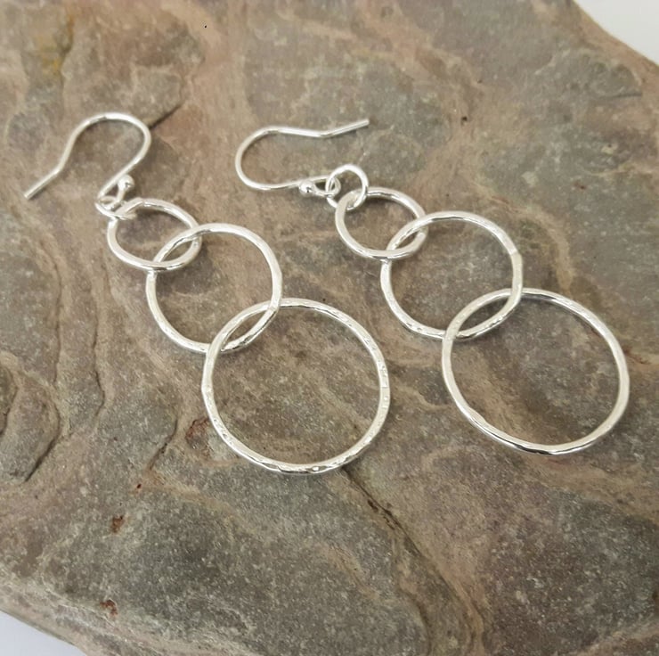 These beautiful dangly drop earrings have been fashioned from 1.2mm sterling silver wire, forged with a ball-pein hammer to make it sparkle in the light. Each has three linked circular hoops, graduated in size with diameters of 1.0,1.5 and 2.0cm.They are suspended by means of jump rings from elegant beaded silver ear hooks, stamped .925 for sterling. The total drop below the hook is 4.3cm. These earrings are very mobile and dance freely as you move around. They are light and comfortable to wear, weighing only 1.8g each.