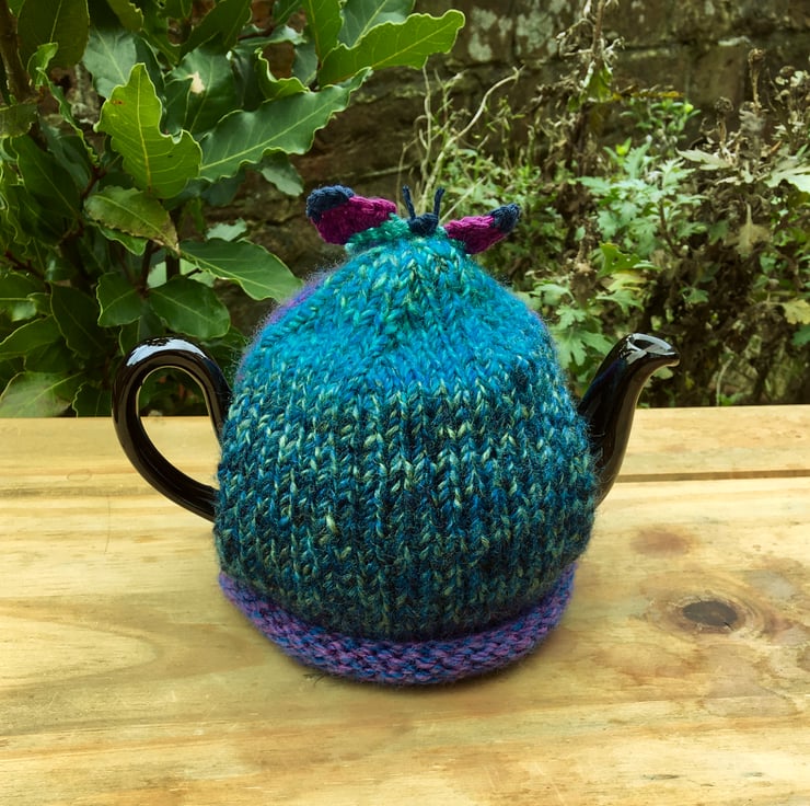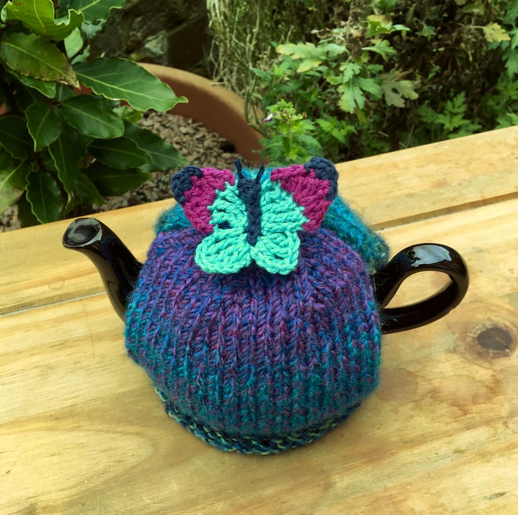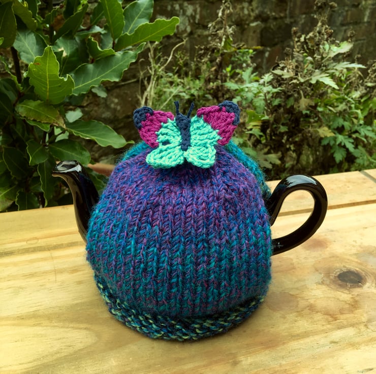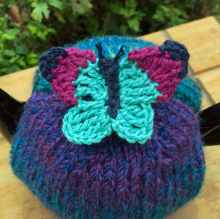 I have crocheted the butterfly using good quality cotton yarn in complementary shades of turquoise, magenta and navy blue. It is sewn on to the top of the tea cosy. I have used a lovely soft multicoloured chunky yarn to hand knit the body of the cosy. It has shades of turquoise, purple, green and navy blue.