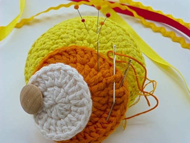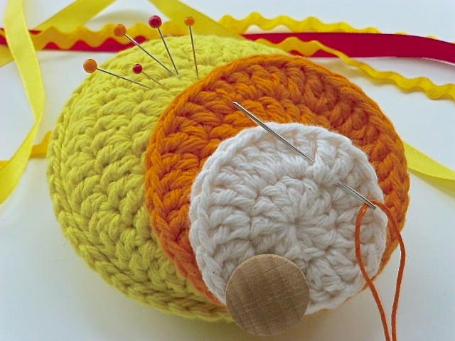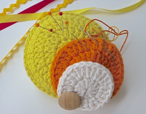 The yellow base is padded and individual circles radiate from the yellow. It has an orange circle and a smaller cream circle. It is finished with a wooden button. The circles can be moved out by sliding them to the the side. They provide sections for needles and thread. Your tools for sewing will be organised.