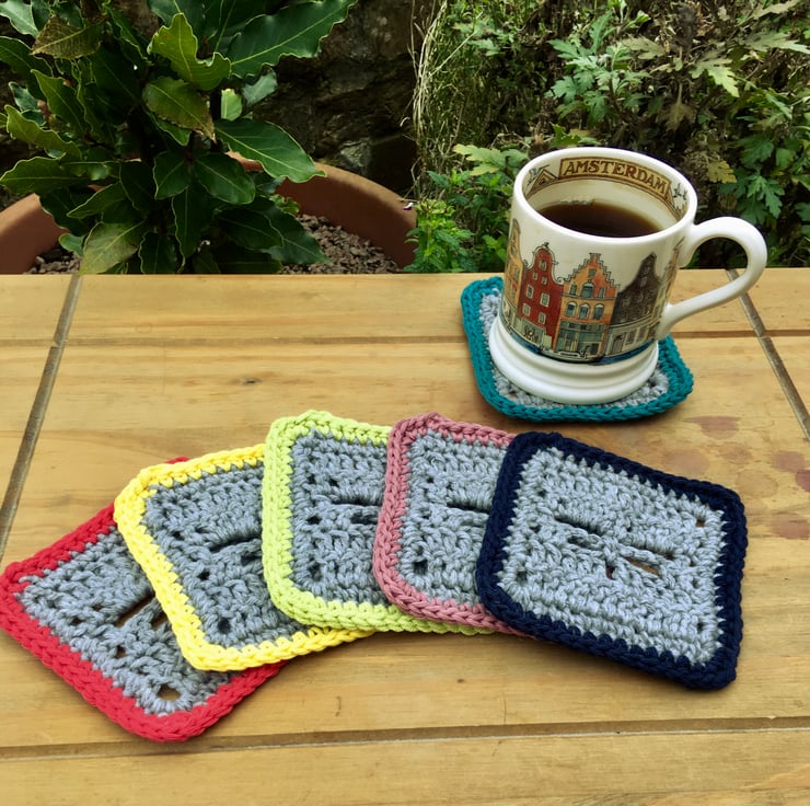 Decorate your home or office with this pretty set of crochet dragonfly coasters. The coasters have been crocheted using grey aran recycled wool and edged with leftover scraps of cotton yarn. The colours of the six coasters are yellow, lime green, navy blue, bright coral, dusky pink and teal.