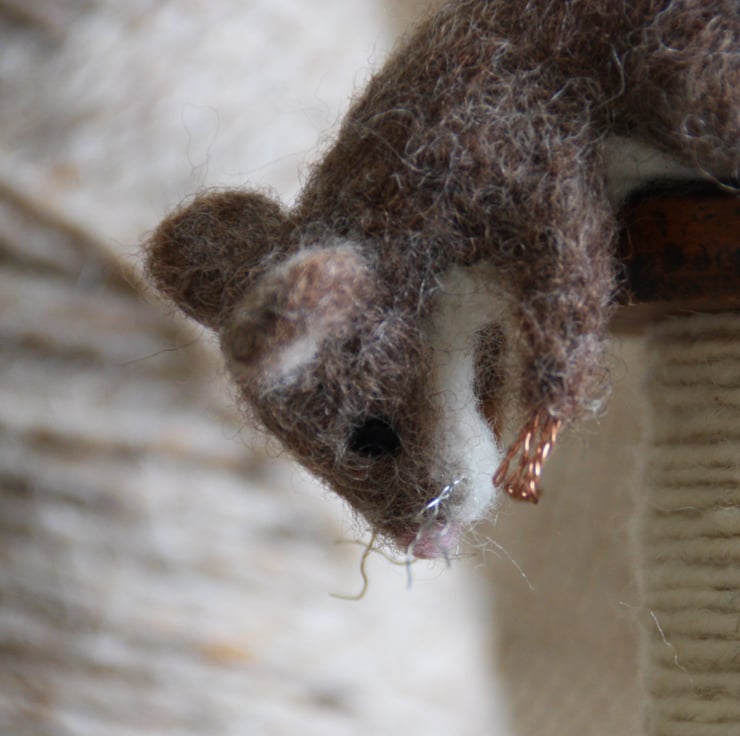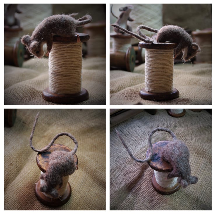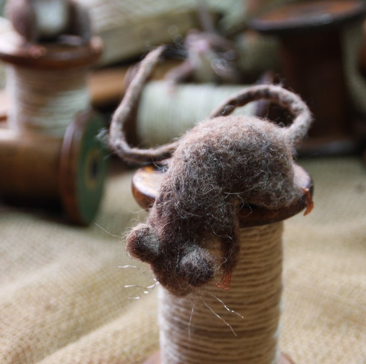 This needle felted mouse, with wire features, is approximately life-sized. The whole sculpture (including bobbin) measures approximately 13cm high x 15cm wide at its widest point (including tail).
