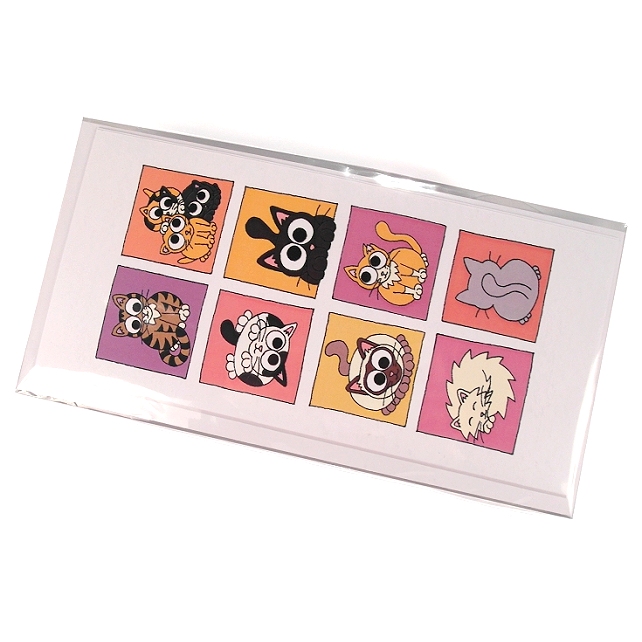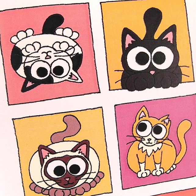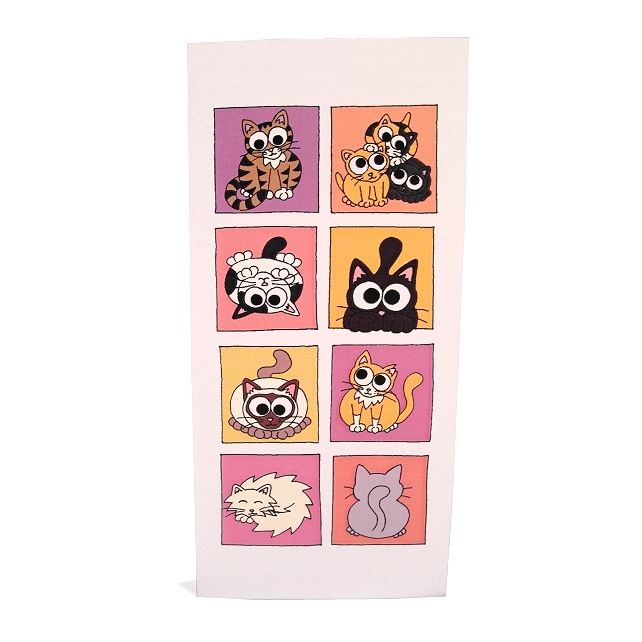 8 colourful boxes in pink, purple, orange, yellow and red have a variety of cute cats. The cartoon kitties are: a tabby cat, 3 little kittens clambering on top of each other, a rolling over white and black cat, a curious black cat, a siamese cat, a ginger tom, a sleeping longhaired white cat, and a grey cat ignoring everyone.