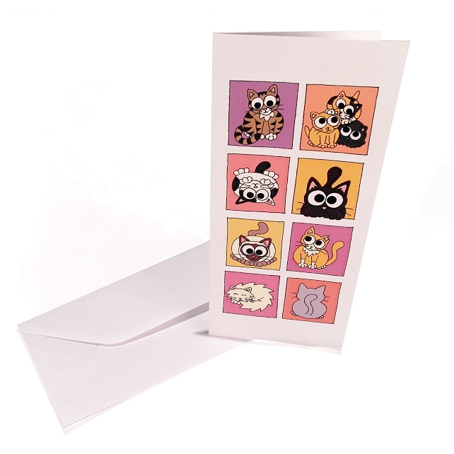 This original cartoon cat design by Kim Onyskiw is printed on a 105mm x 210mm (DL) long card. The card is blank inside for your own message and will come with a white envelope.