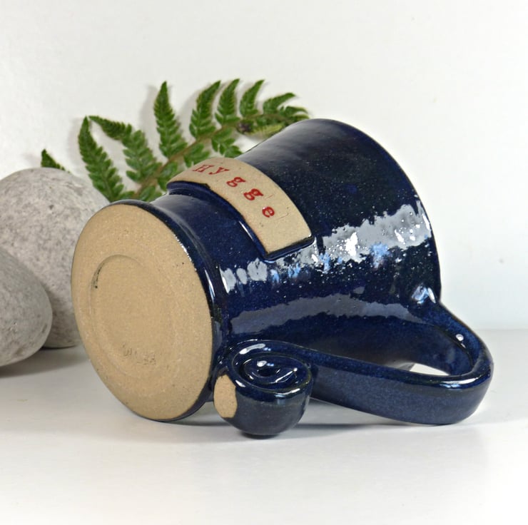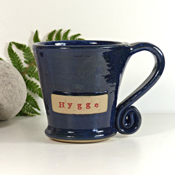 This gorgeous blue mug has the words 'Hygge' stamped into raised clay on the side of the mug.