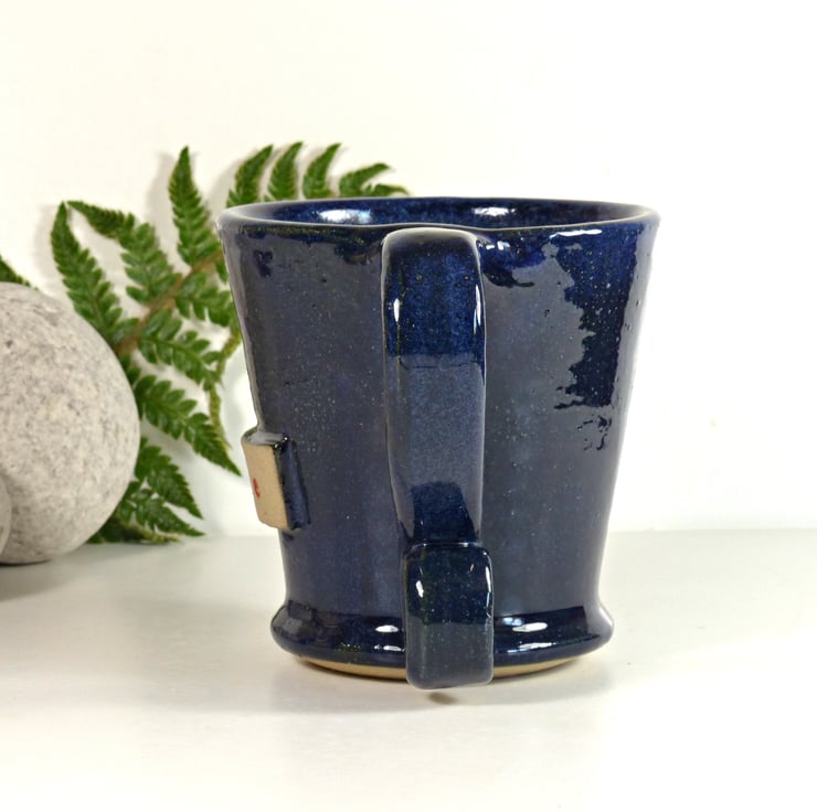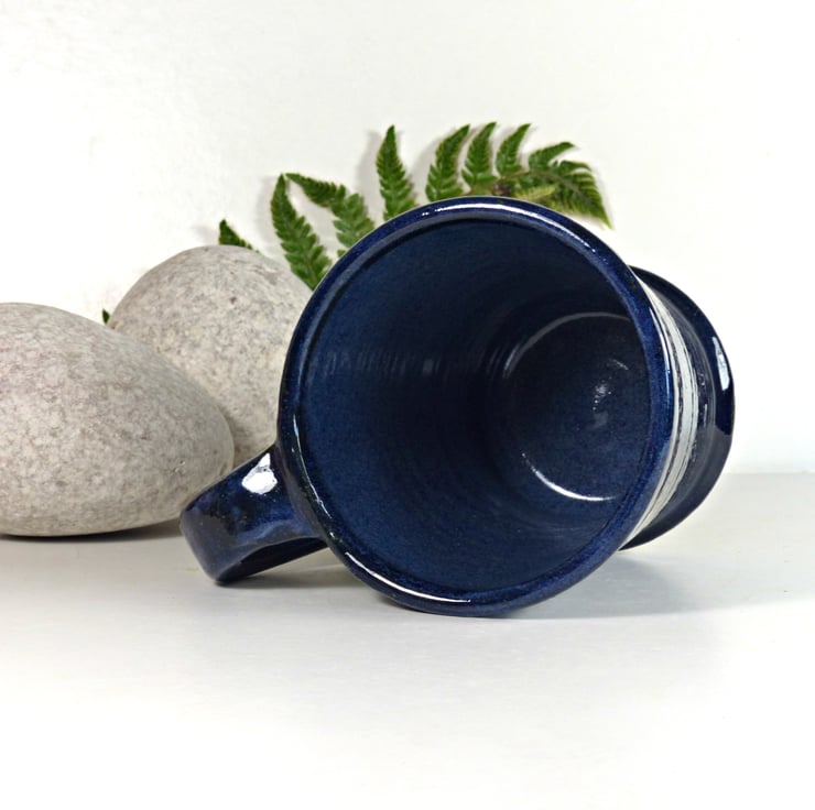 I threw this mug on the potter's wheel using a white stoneware clay. I then turned the base and added the handle and decoration before bisque firing the mug. I glazed it using a lovely rich glaze and refired to 1240C stoneware making it strong and durable.