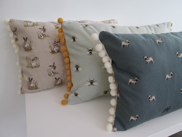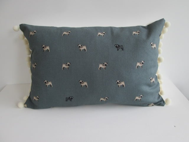 Sophie Allport pugs fabric cushion with cream back and central zip and cream bobbles