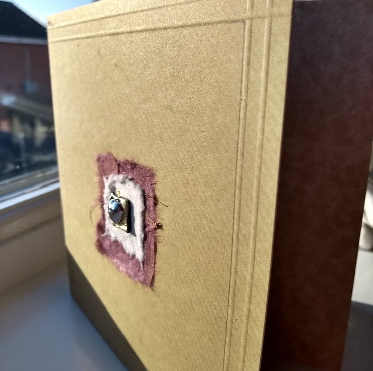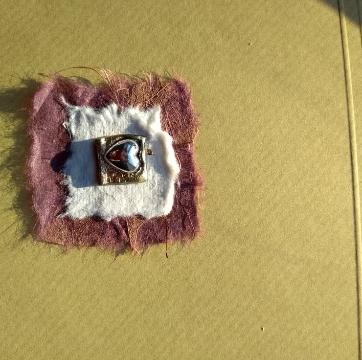 A completely handmade and uniquely designed card. Consisting of a square of gold meldable plastic which has a silver heart in the centre. Mounted onto ivory then aubergine mulberry paper then onto brown paper effect quality card.