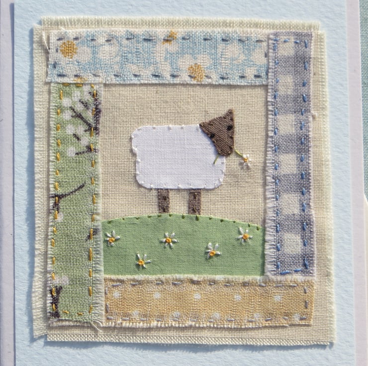 A unique hand-stitched miniature applique cut from my own hand-dyed recycled cotton with embroidered details. The borders are cut from pretty cotton prints, everything hand-stitched into place. Suitable for child's birthday, new baby, Christening, Baby Shower........