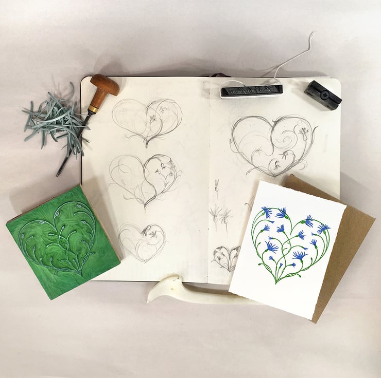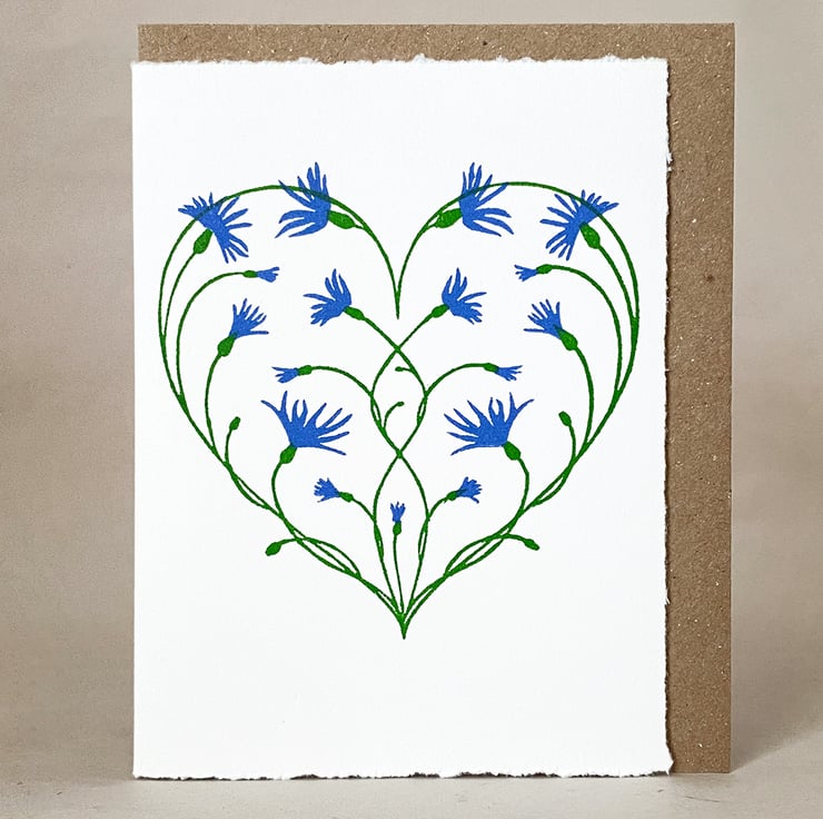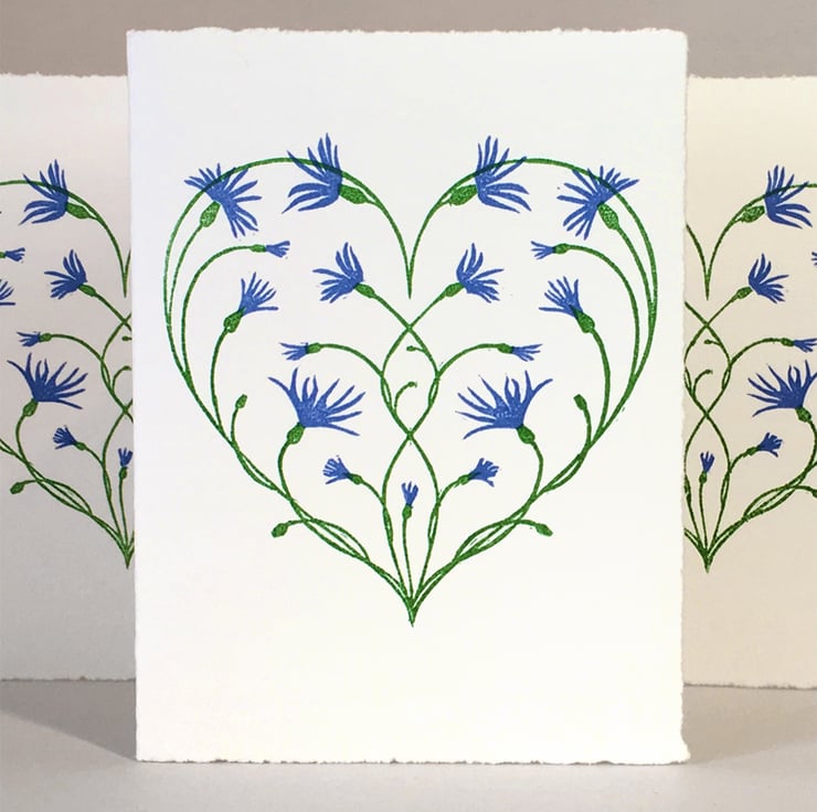 This is my 2nd-in-series inspired by Botticelli's Birth of Venus. Thallo is the ancient greek goddess of spring, protector of new growth - her name means 'bloom'. In his painting Botticelli has purposefully decorated Thallo's garment in beautiful cornflowers - I adore his depiction of them & sketched my cornflowers from his painting, paying attention to the blossoms (his genius, simple brush strokes) and intertwined stalks & buds, which I then attempted to apply, in this cut Lino print, to form the heart.