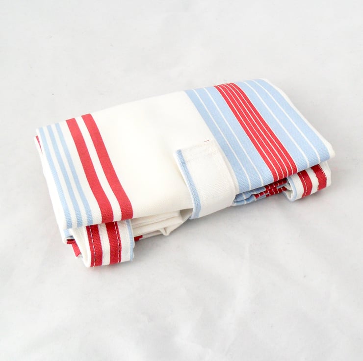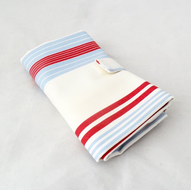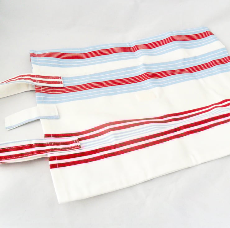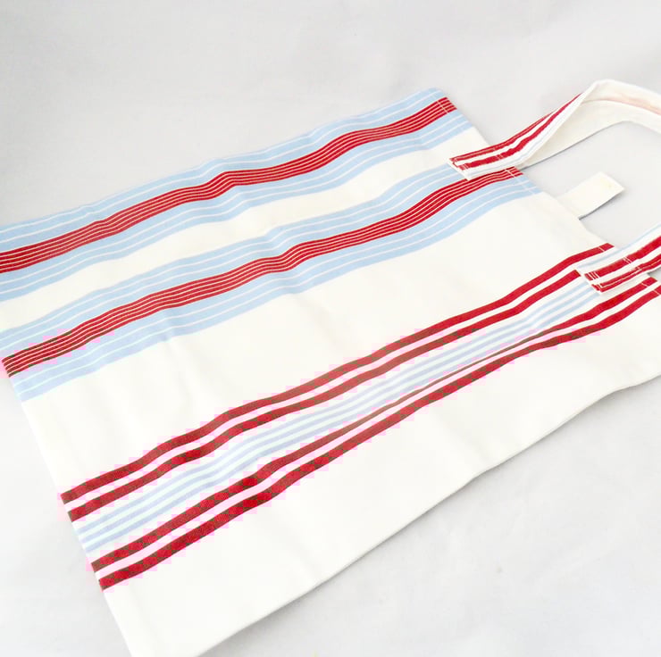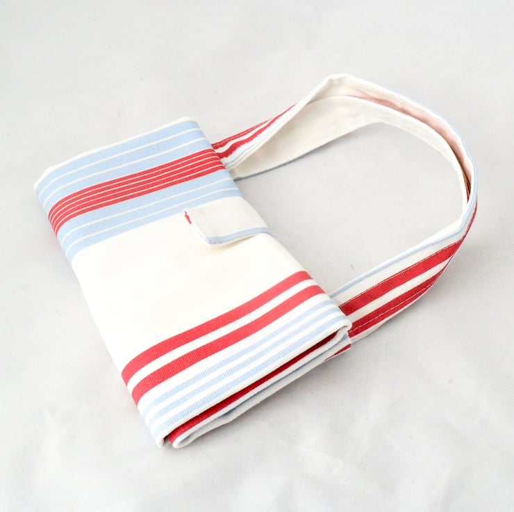This useful shopping bag folds up to fit neatly in your handbag, ready for when you need it. It's made of strong cotton in a red, white and blue stripe pattern. The bag is unlined but is constructed using French seams, so there are no raw edges inside. Once folded it is secured with a velcro strip and so remains neatly folded whilst in your handbag. It has wide handles that won't cut into your fingers, a better alternative to plastic carrier bags.