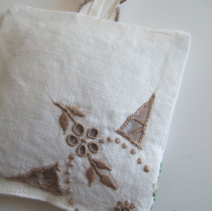 The front and back are made from two separate pieces of vintage embroidery, and create a different design front and back