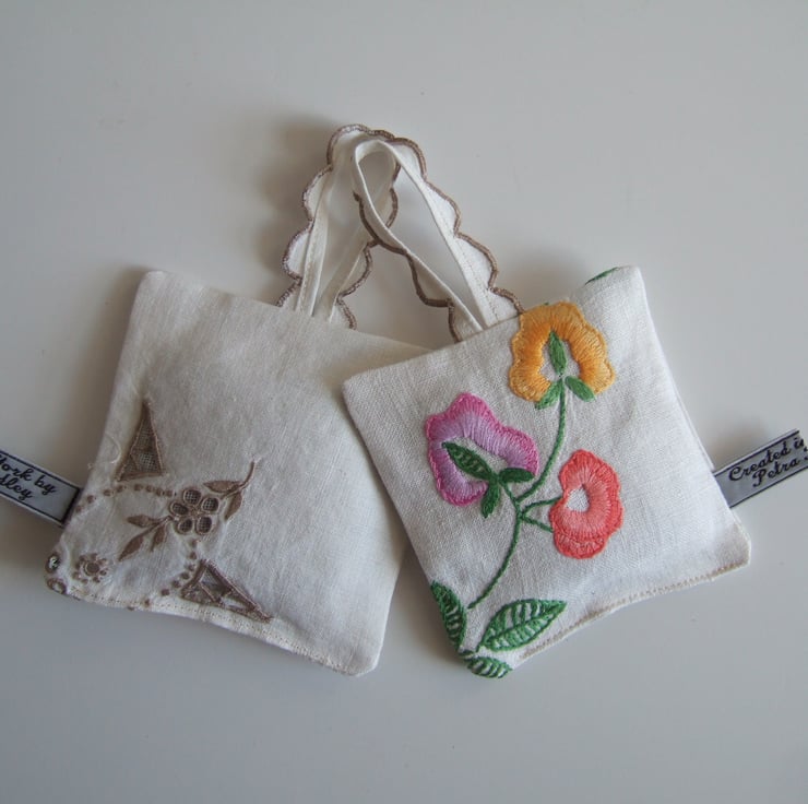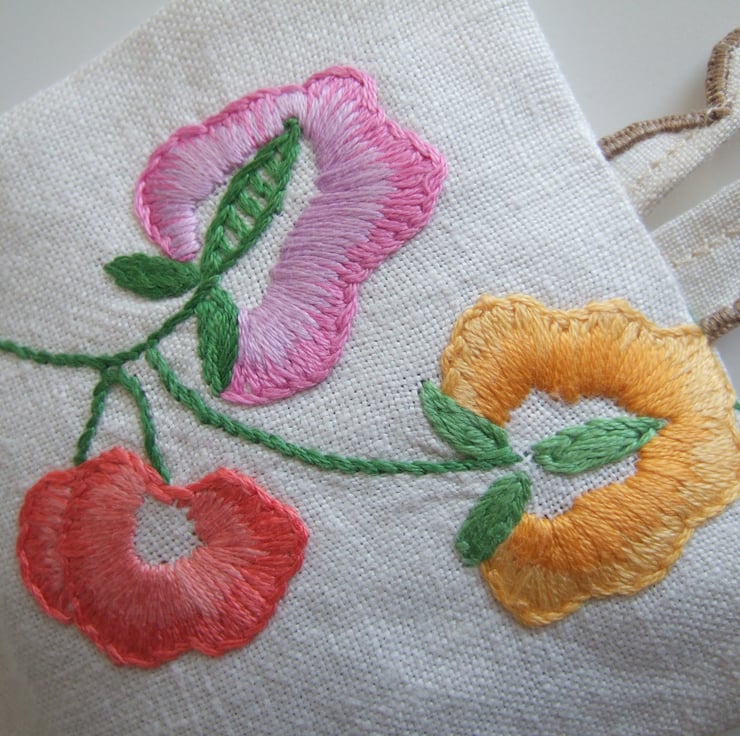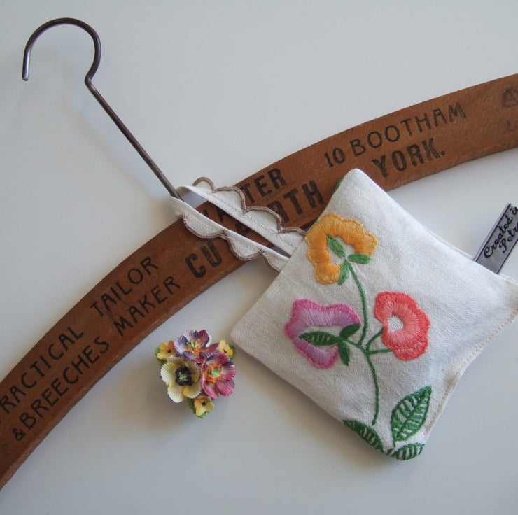Vintage sweet pea embroidered lavender bag with dried Yorkshire lavender.