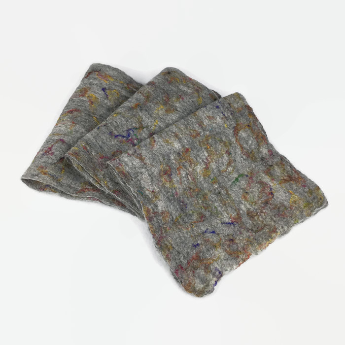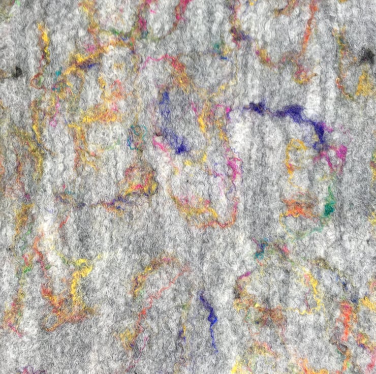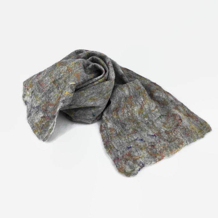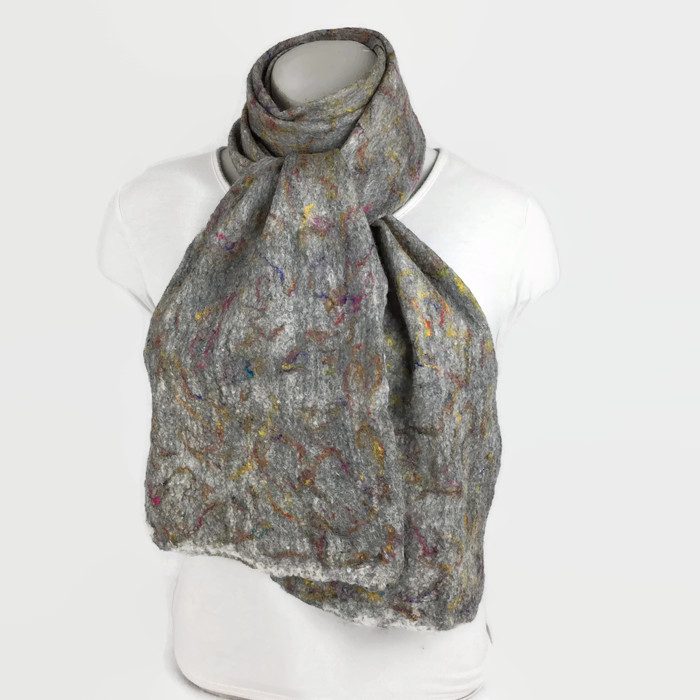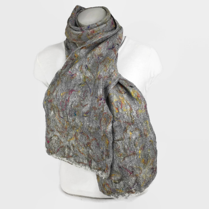 Hand felted using several fine layers of natural grey and natural white merino wool, this long scarf is super soft and lightweight. Included in Seconds Sunday as a clearance/end of line item. A layer of multicoloured silk fibres has been added to both sides of the scarf prior to felting which gives it a lovely subtle, multicoloured pattern.