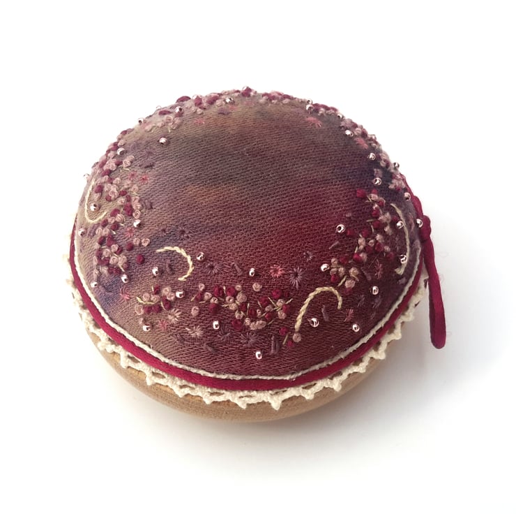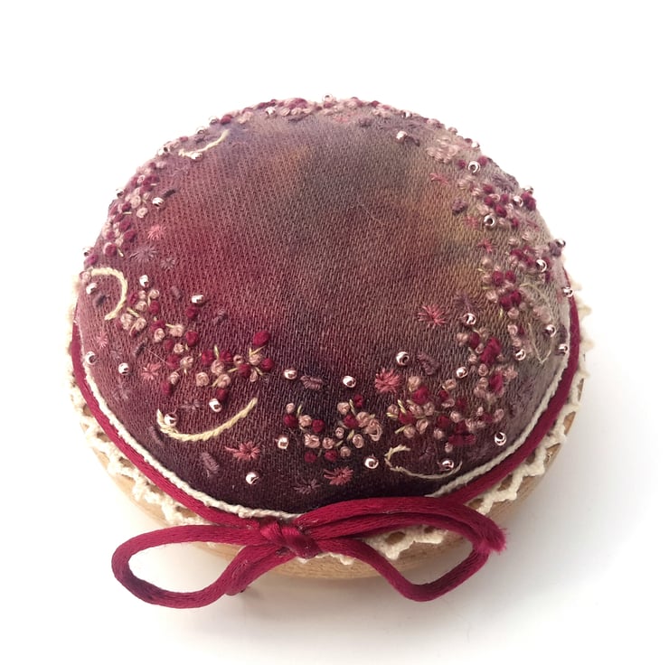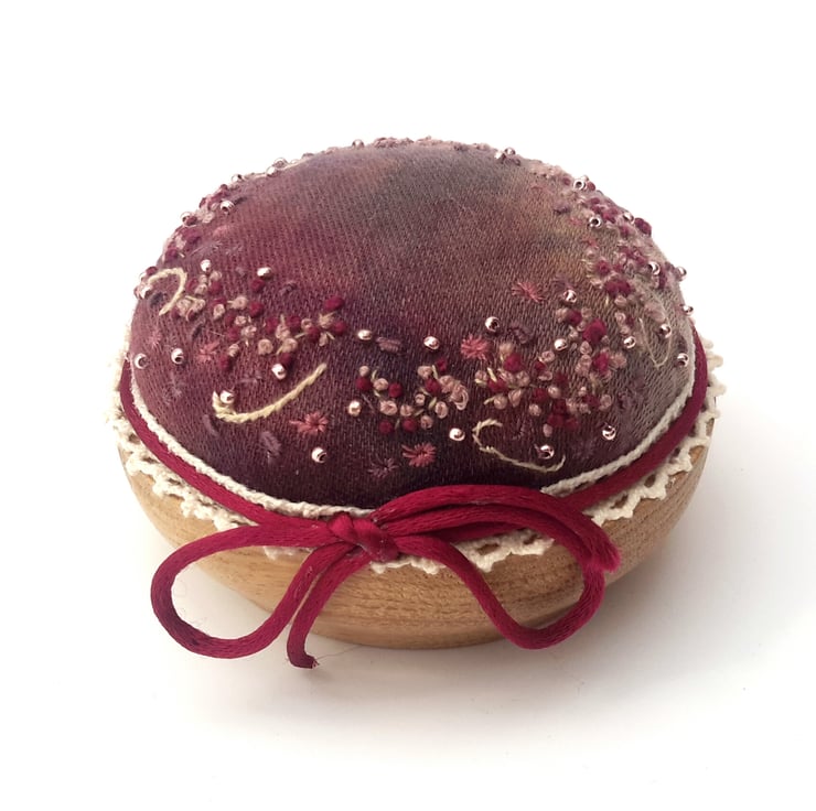 A luxury, unique hand embroidered pincushion mounted onto a hand crafted oak base