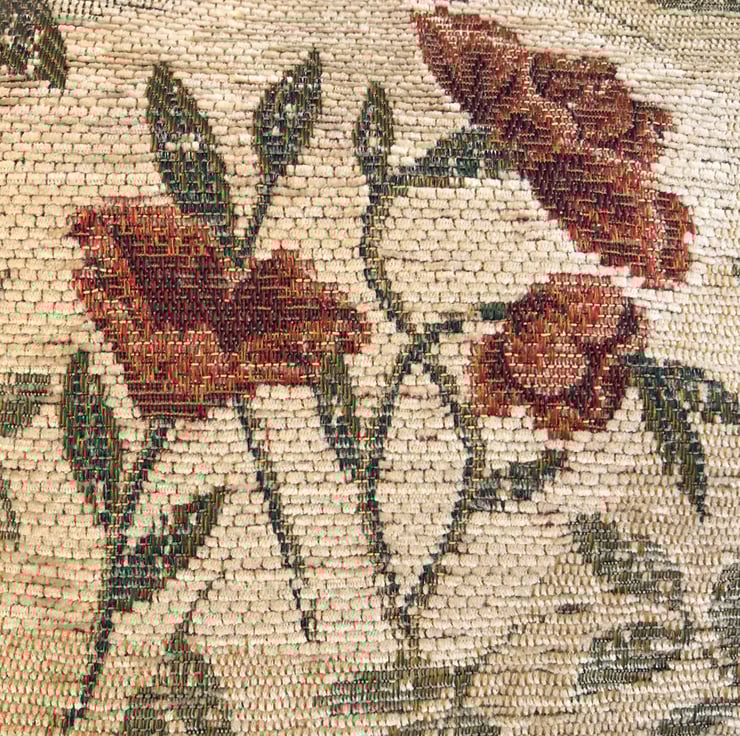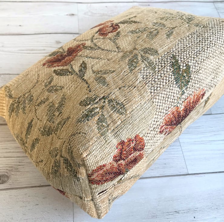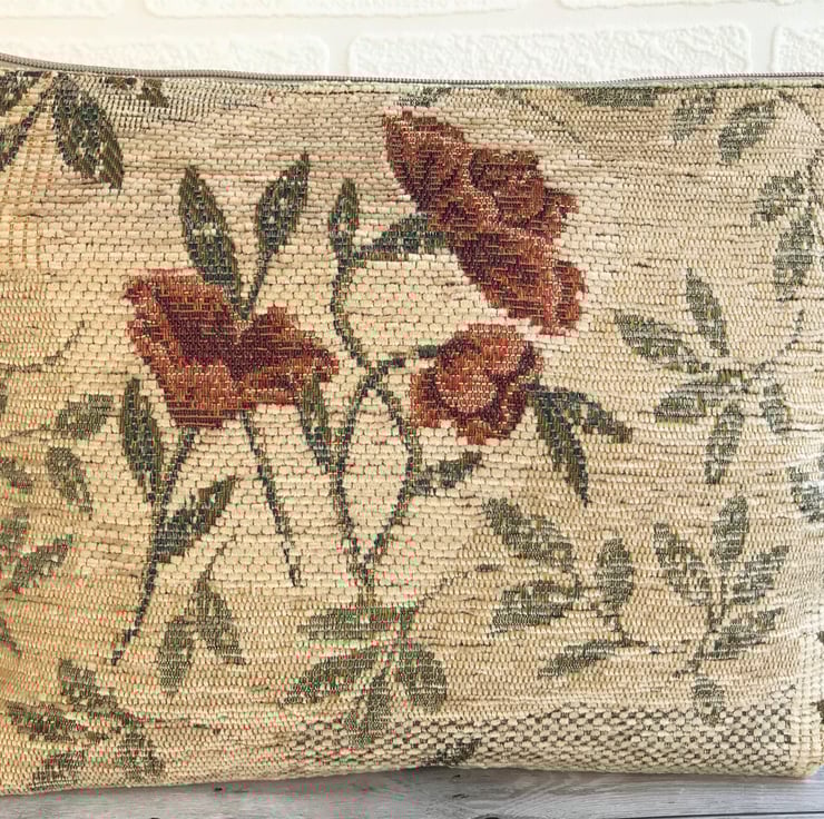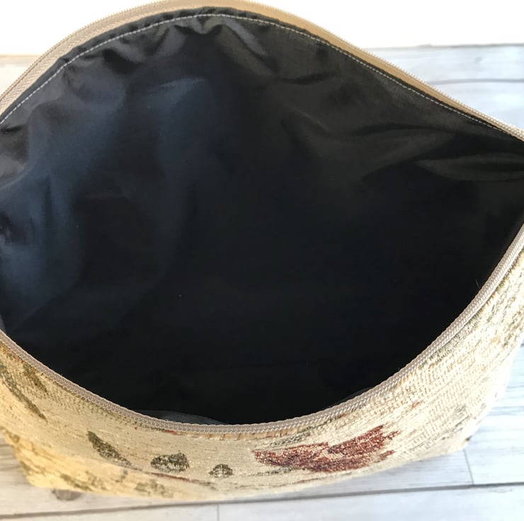 A luxurious toiletry bag in lovely textured fabric with woven floral patterns in warm shades of terracotta, burnt orange and sage green on a beige background. The beautiful textured fabric and pattern design is reminiscent of period tapestries. The bag fastens with a beige zip and the inside is fully lined with a black water-resistant lining. The base of the bag is boxed giving a spacious interior.