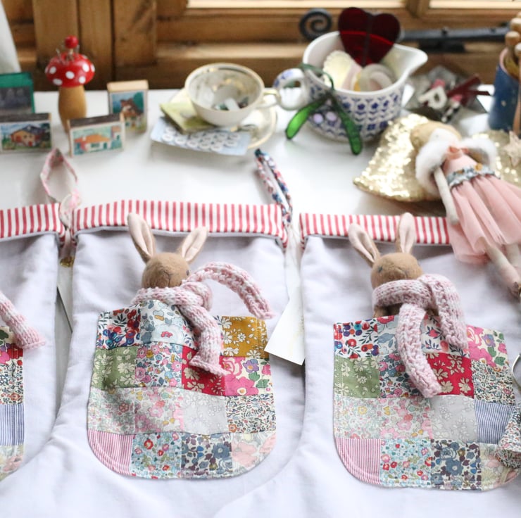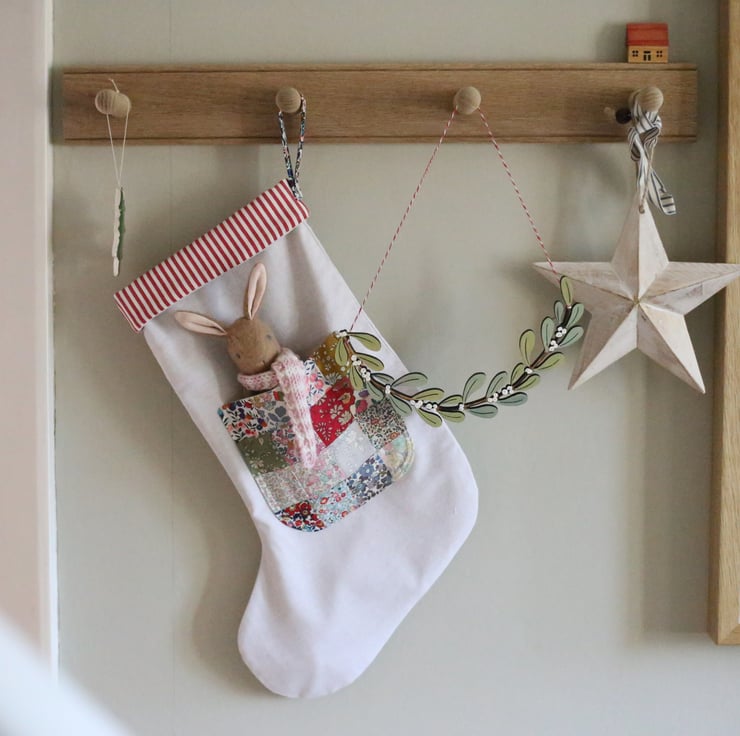Each stocking has a handmade patchwork pocket made from a selection of beautiful Liberty of London tana lawn prints.