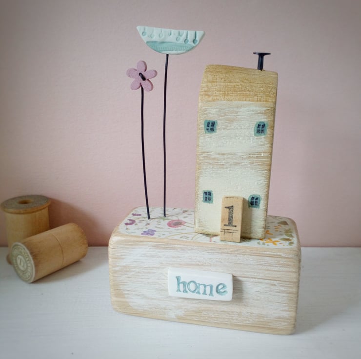 A delicately made free standing piece in muted tones for a mantle or shelf, this cosy little house is looking for a home.