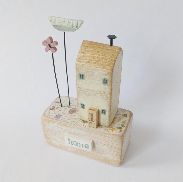 This little hand-painted oak wood house has a little clay flower and a button flower growing in the garden.