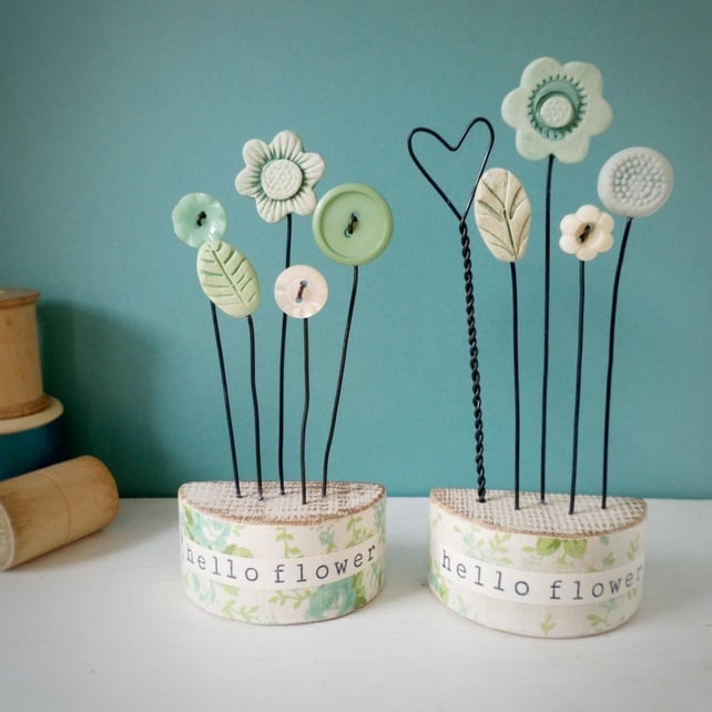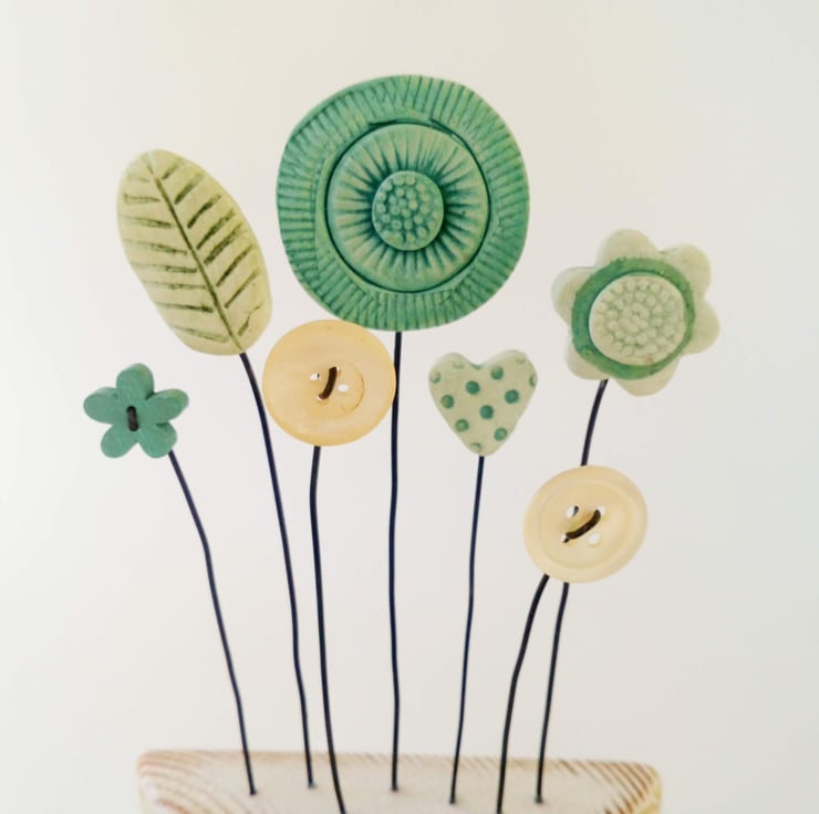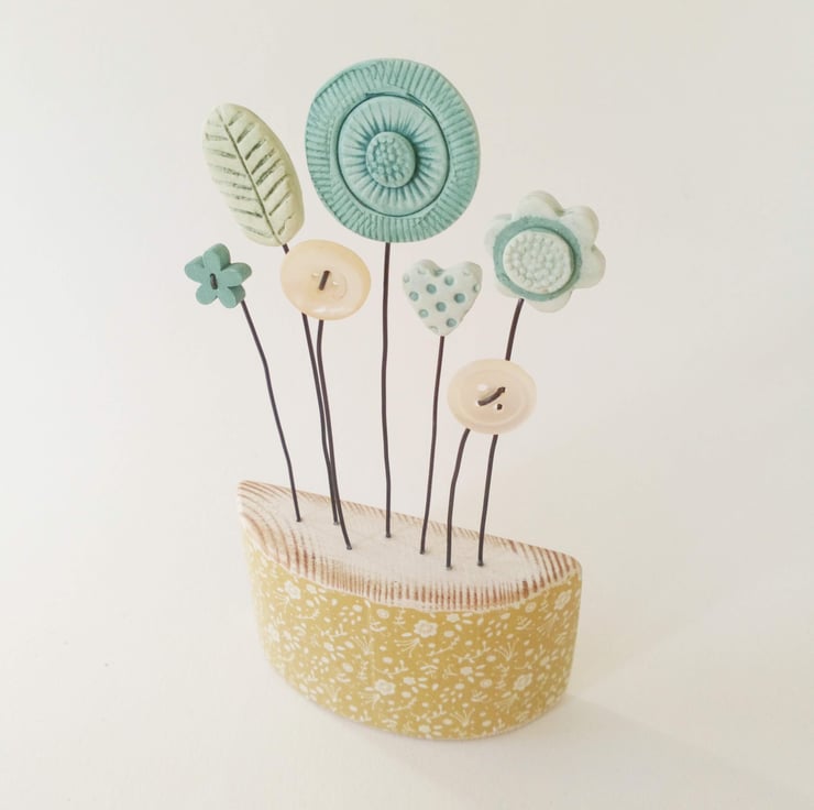 Button and clay flowers grow in this flower garden, standing on their wire stalks in a curved and decoupaged wood block.