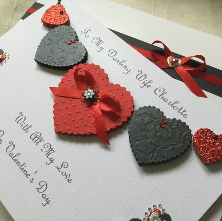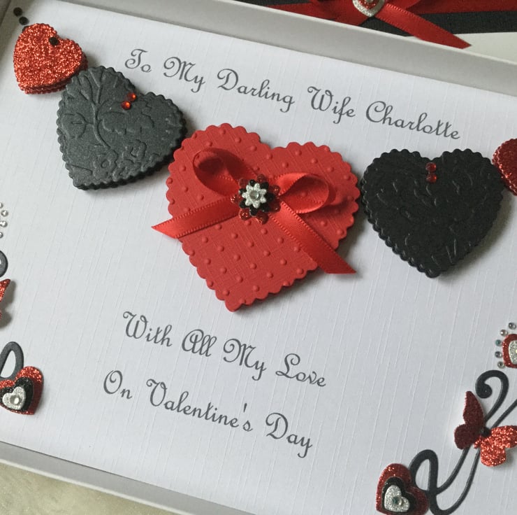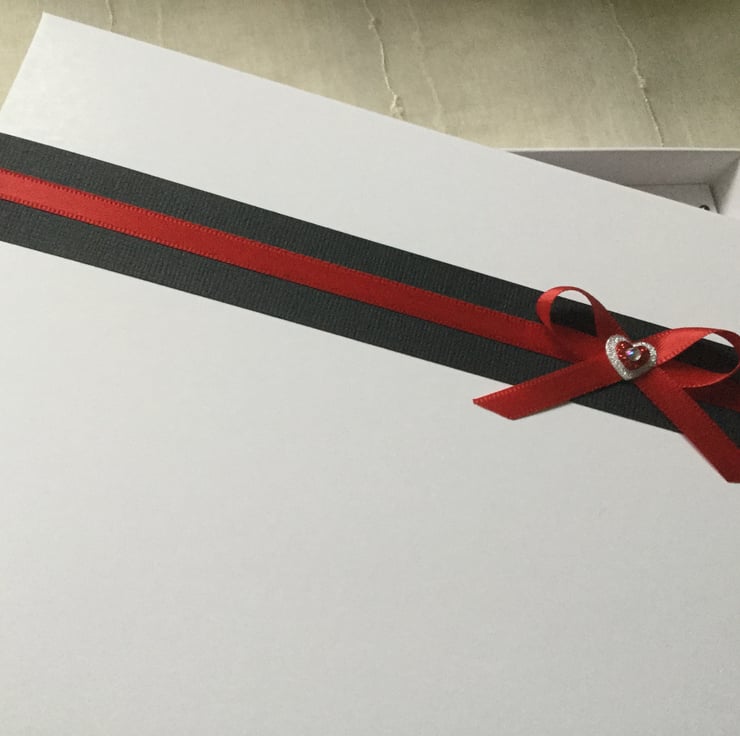 This handmade gift boxed card can be personalised for any occasion such as Valentine’s Day, a birthday or anniversary. It is on 300gsm cardstock and decorated with ribbons and gems. It comes in the matching decorated box and makes a wonderful keepsake.