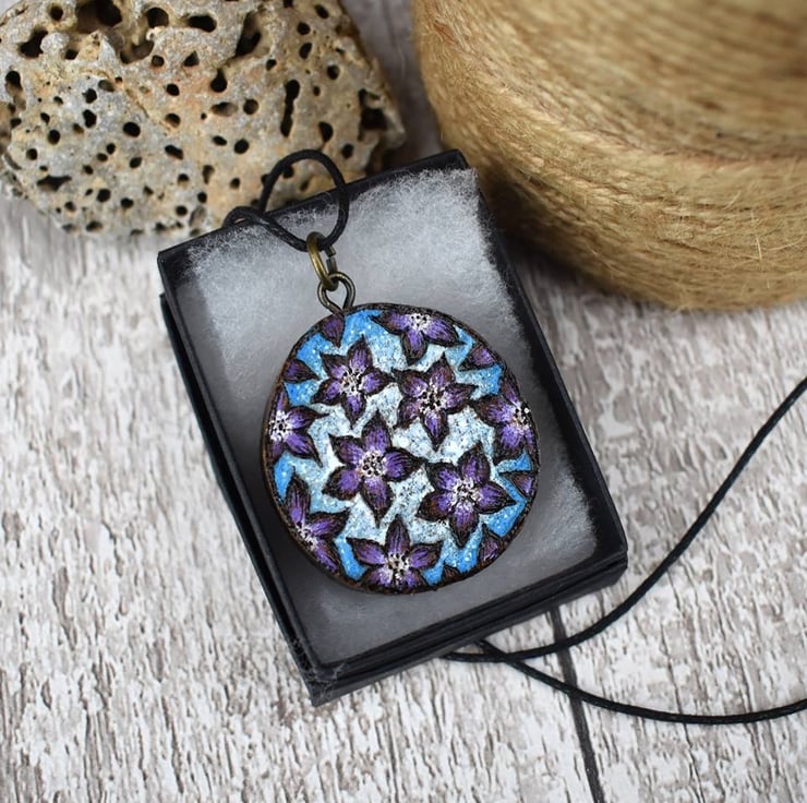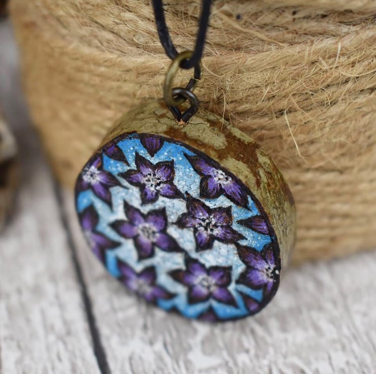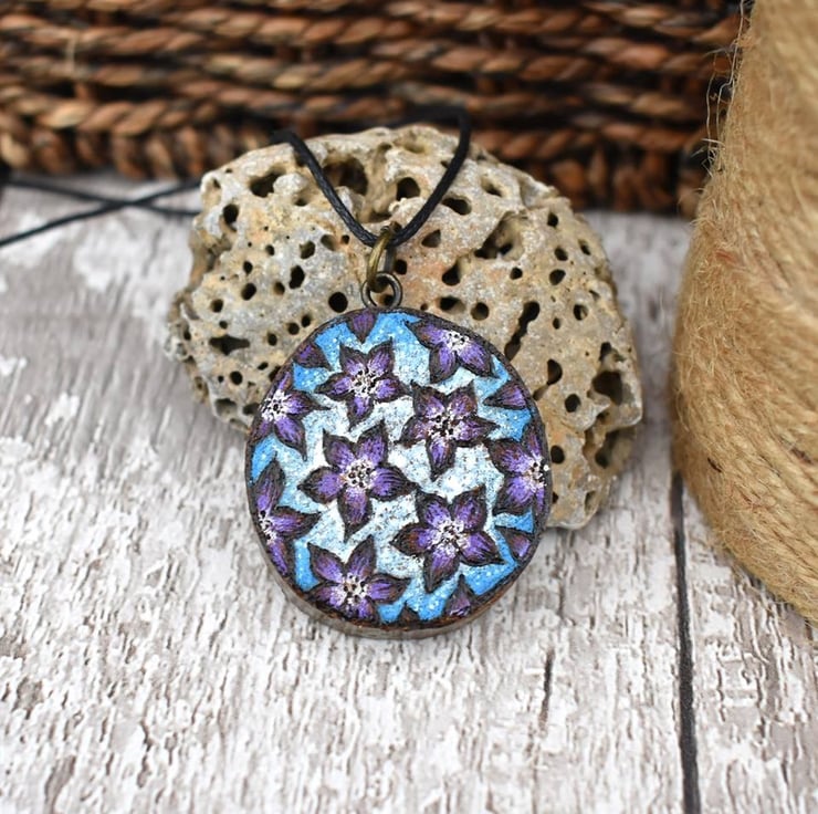 A gorgeous hand burned floral pendant, with a mass of purple periwinkle style flowers. It’s quite a chunky pendant, but not overly heavy. Burned using pyrography and coloured with vibrant prismacolor pencil. A lovely gift for a birthday, or for a five year wood anniversary.