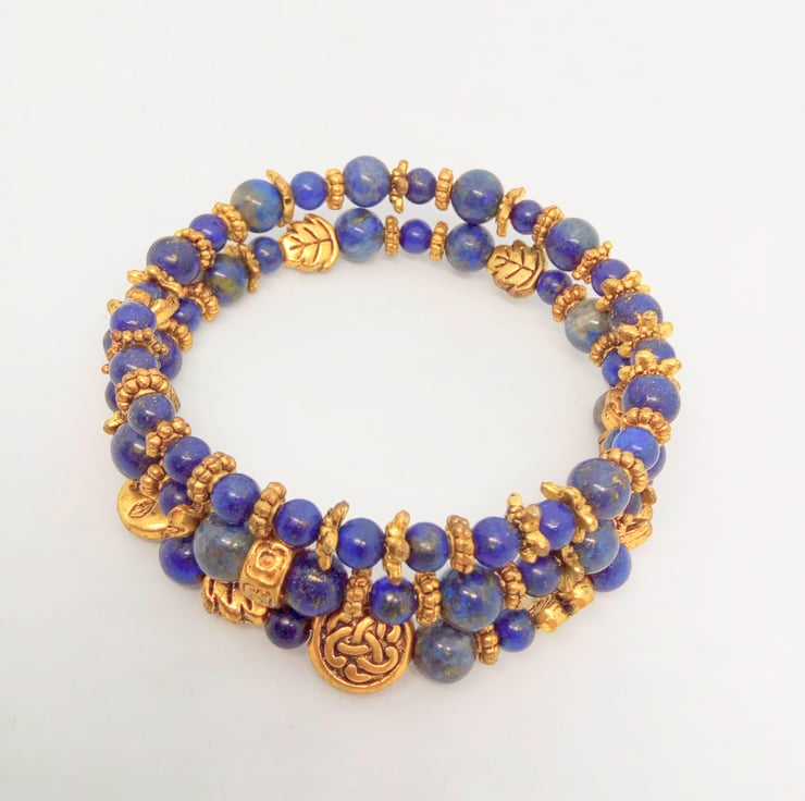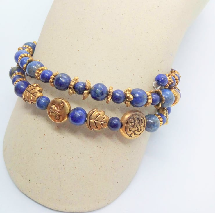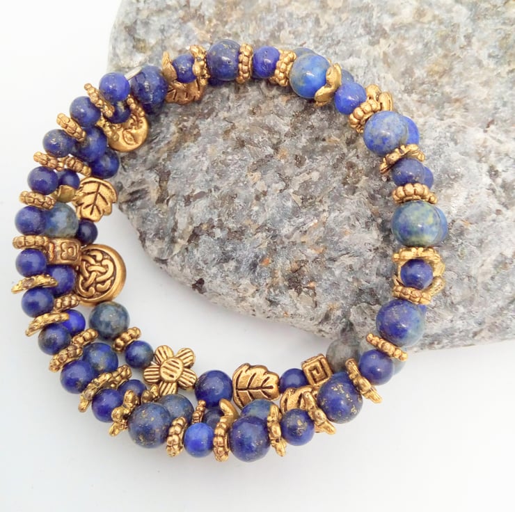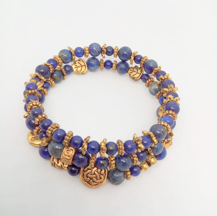 2 strand memory wire bracelet made with blue lapis lazuli beads and gold plated spacer beads. It will comfortably fit a wrist 16 - 17 cm in circumference.