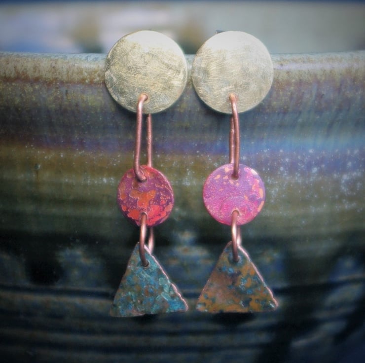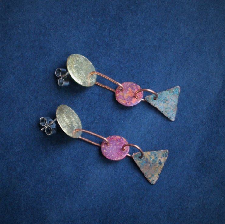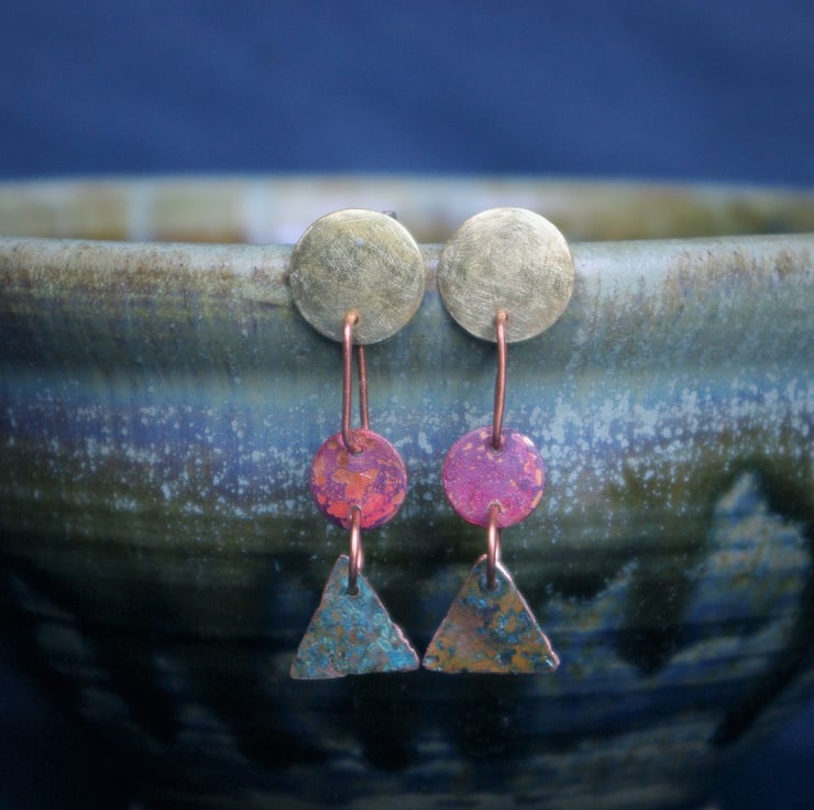 Three geometric shapes hang one under the other with copper jump rings. The top brass circles have a matt surface and a diameter of 12mm.