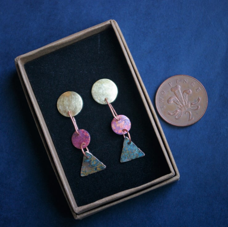 The earrings are worn with a sterling silver stud and butterfly fastening, which is designed to sit nicely on the earlobe and have a dangle of 4cm/1.5 inches from the top of the brass piece to the bottom edge of the triangle.