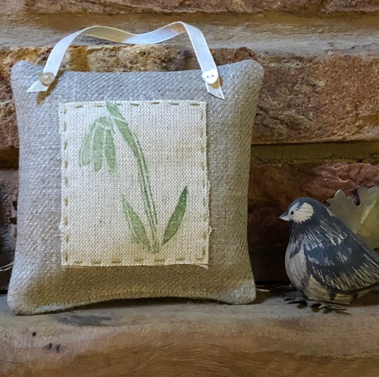A hanging Lavender sachet constructed from a beautiful linen fabric. A small hand printed snowdrop linen square has been decoratively attached with embroidered running stitch .