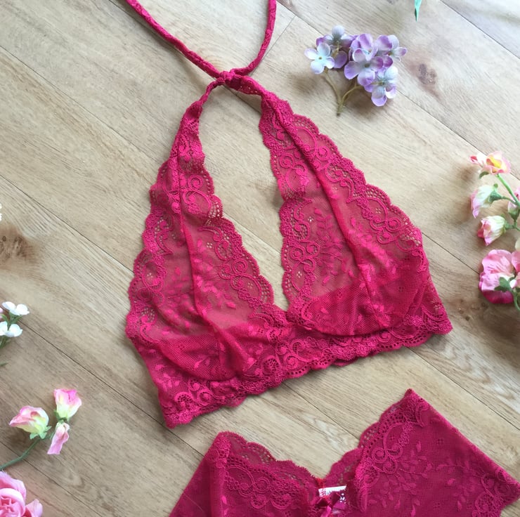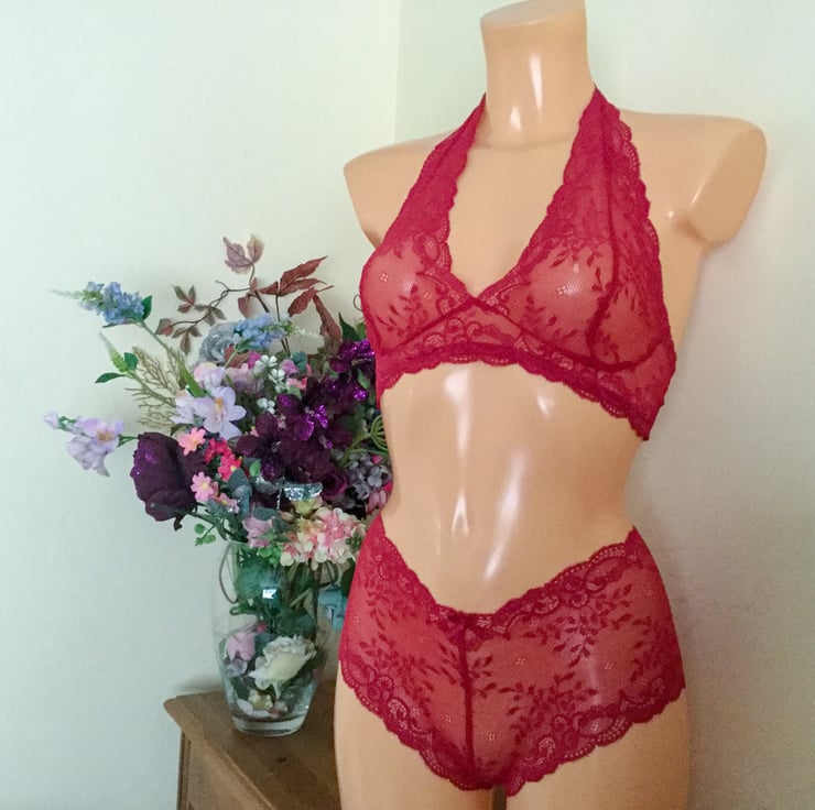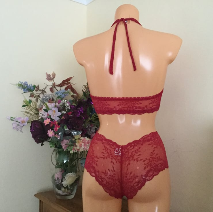 Halter style pomegranate Lingerie set , custom made from hand dyed lace.