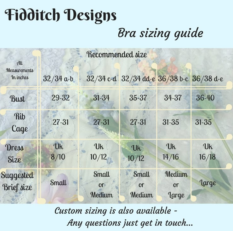 ( The sizing on my lingerie is true to uk standard sizes and all my pieces are made from stretch lace so are quite comfortable and easy to fit. However , custom made Lingerie is non returnable for hygiene reasons so please get in touch if you are unsure on sizing.)