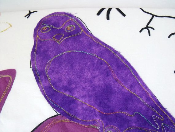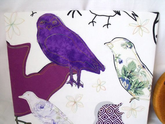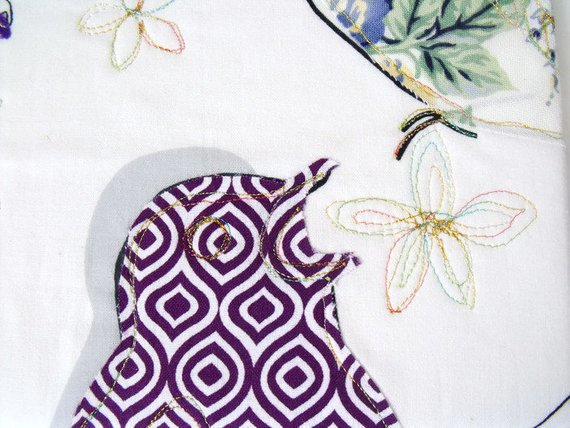 For this piece I've used some black and white Ikea bird print cotton (which you can see in some of the bags I've made ) and cut out bird shapes then machine appliqued them using various purple cotton fabrics.